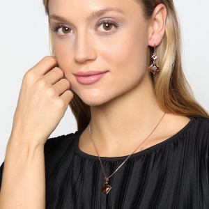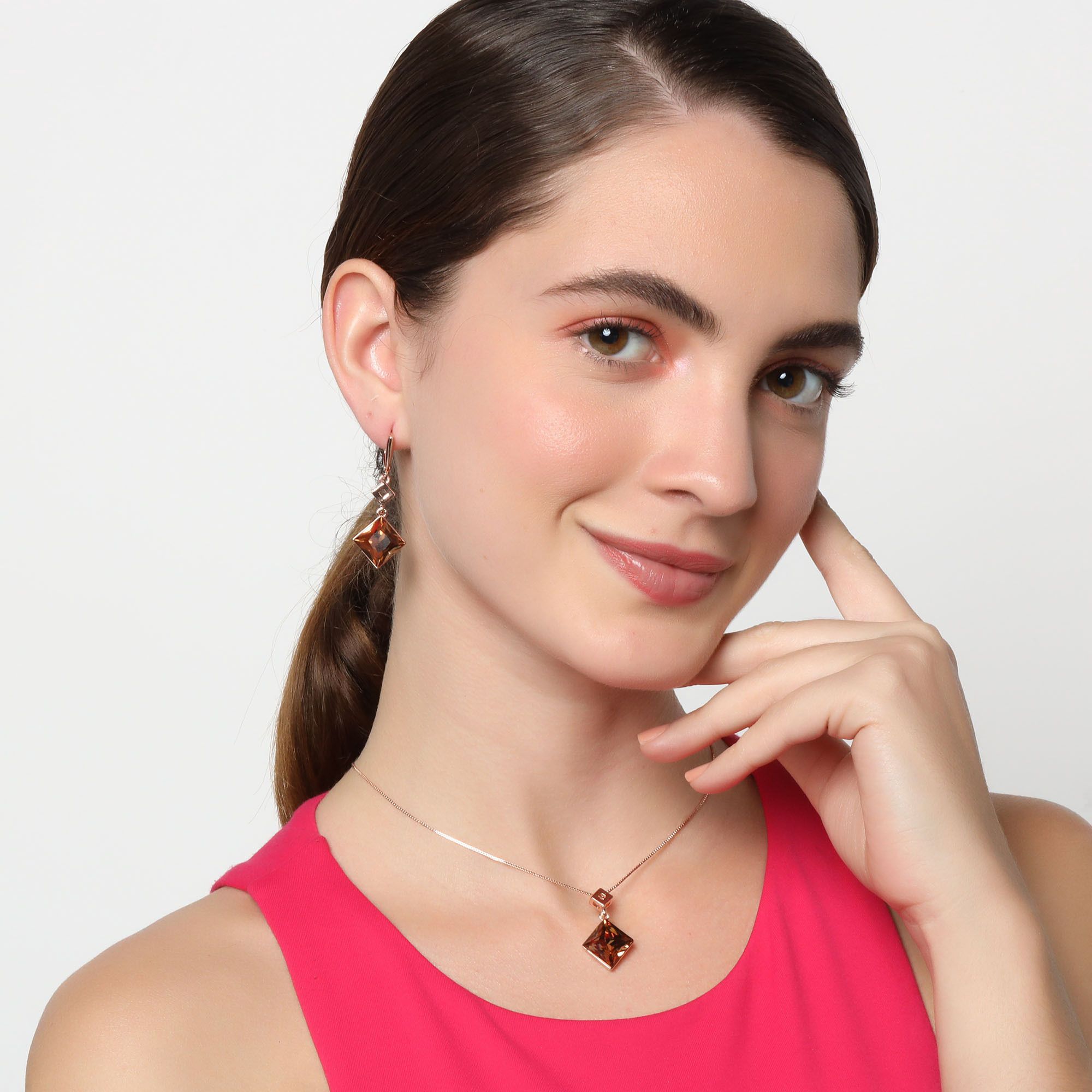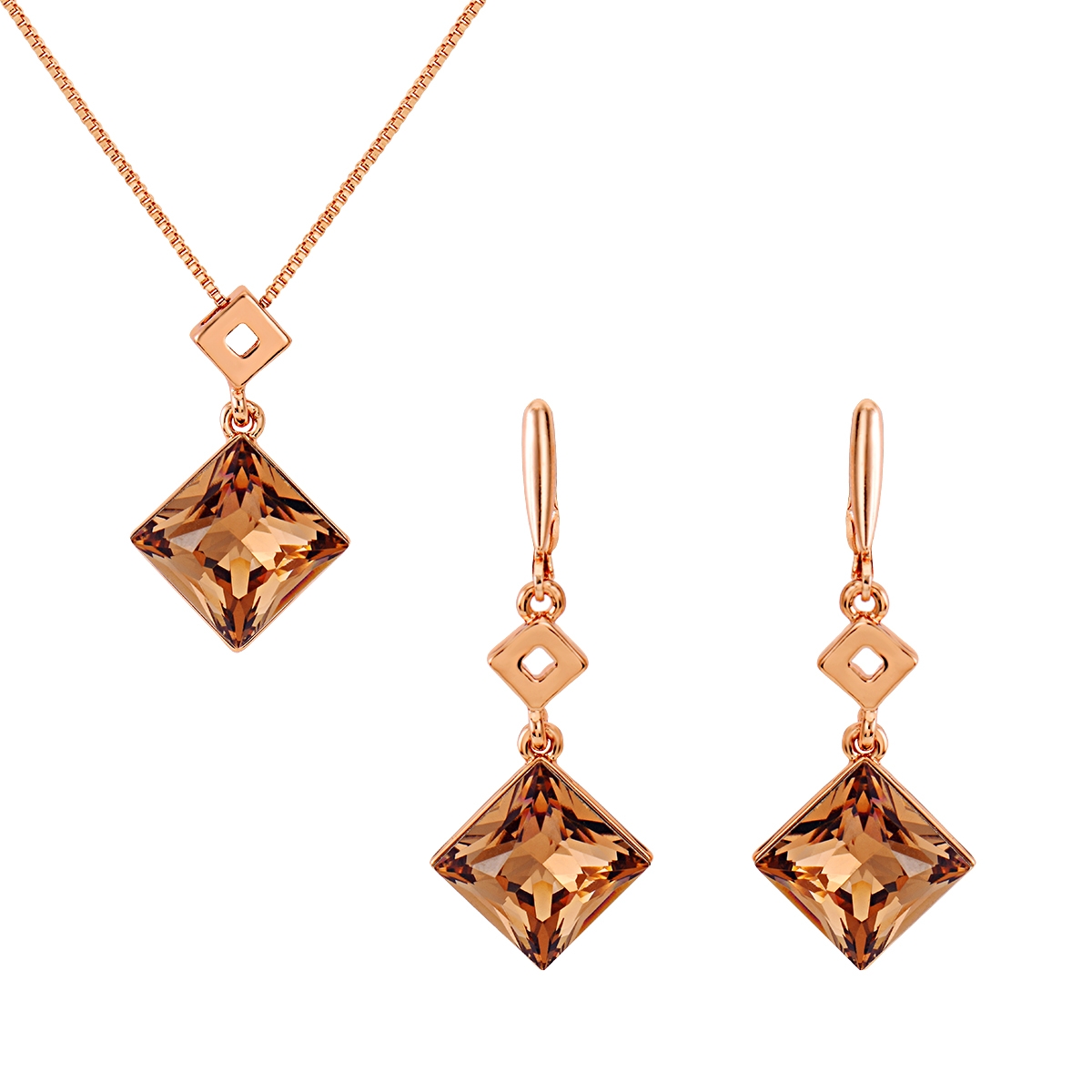 Fino conjunto de dije con cadena y aretes en baño de oro rosa de 18 quilates, diseño de rombos con cristales ámbar corte princesa.