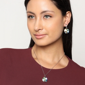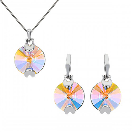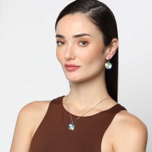 Bonito conjunto de dije con cadena y aretes en baño de oro blanco de 18 quilates, diseño de círculos con cristales aurora boreal corte redondo.