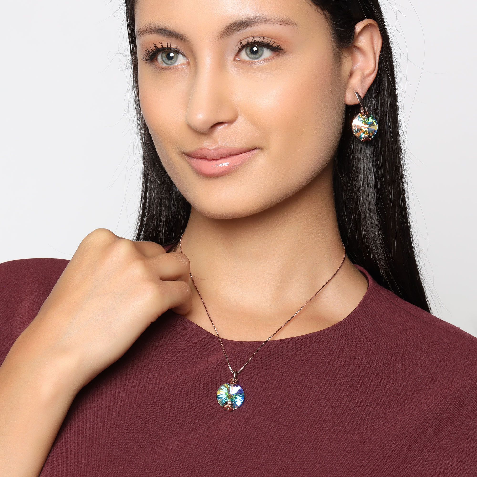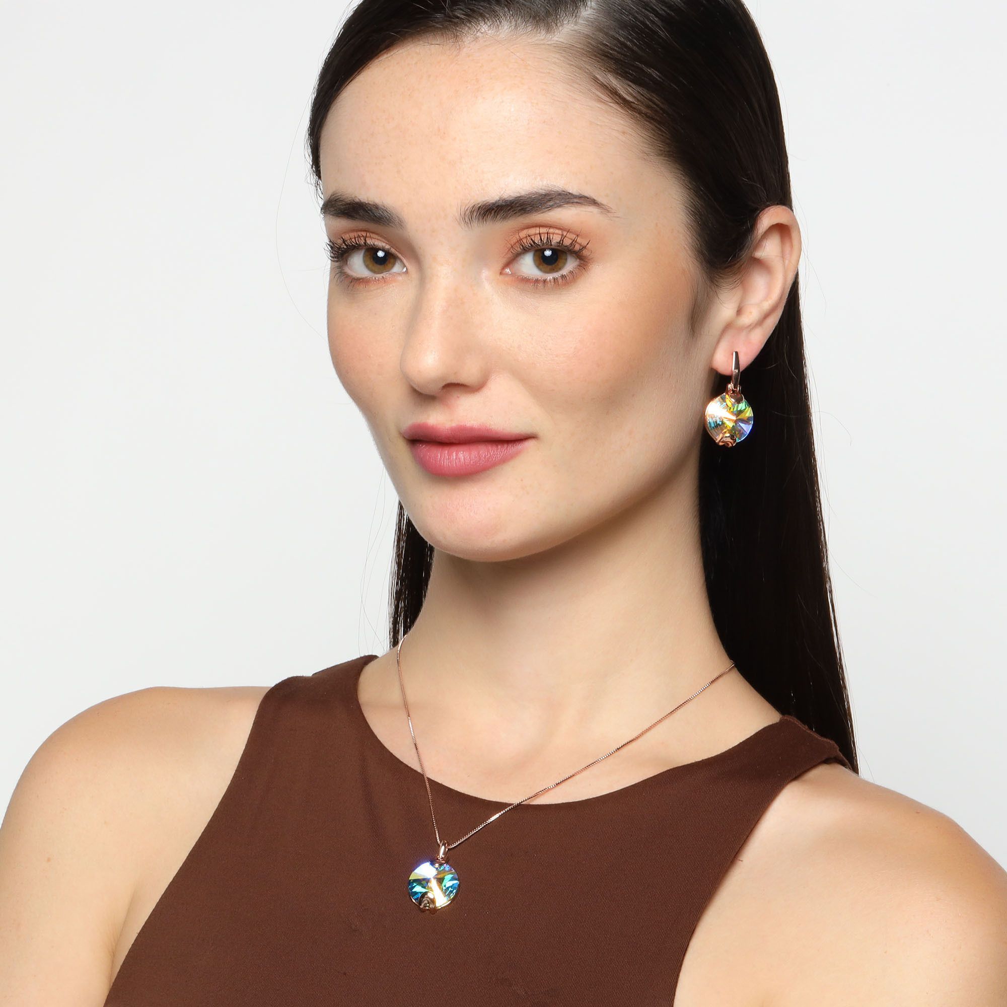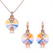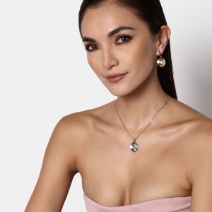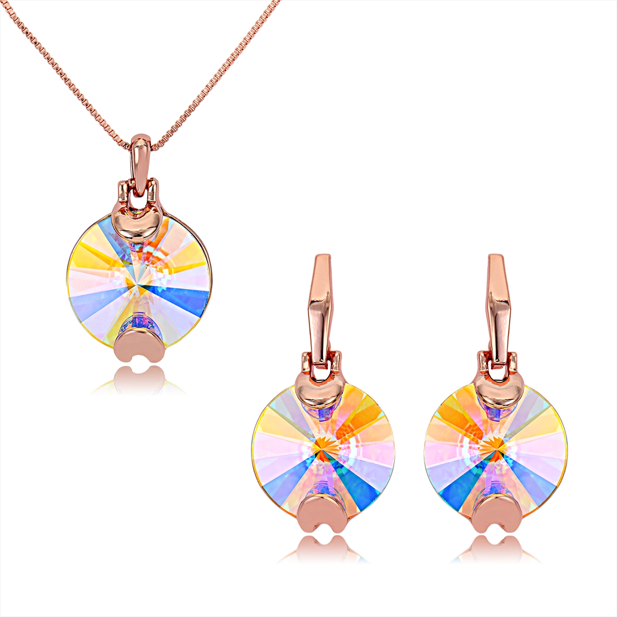 Bonito conjunto de dije con cadena y aretes en baño de oro rosa de 18 quilates, diseño de círculos con cristales aurora boreal corte redondo.