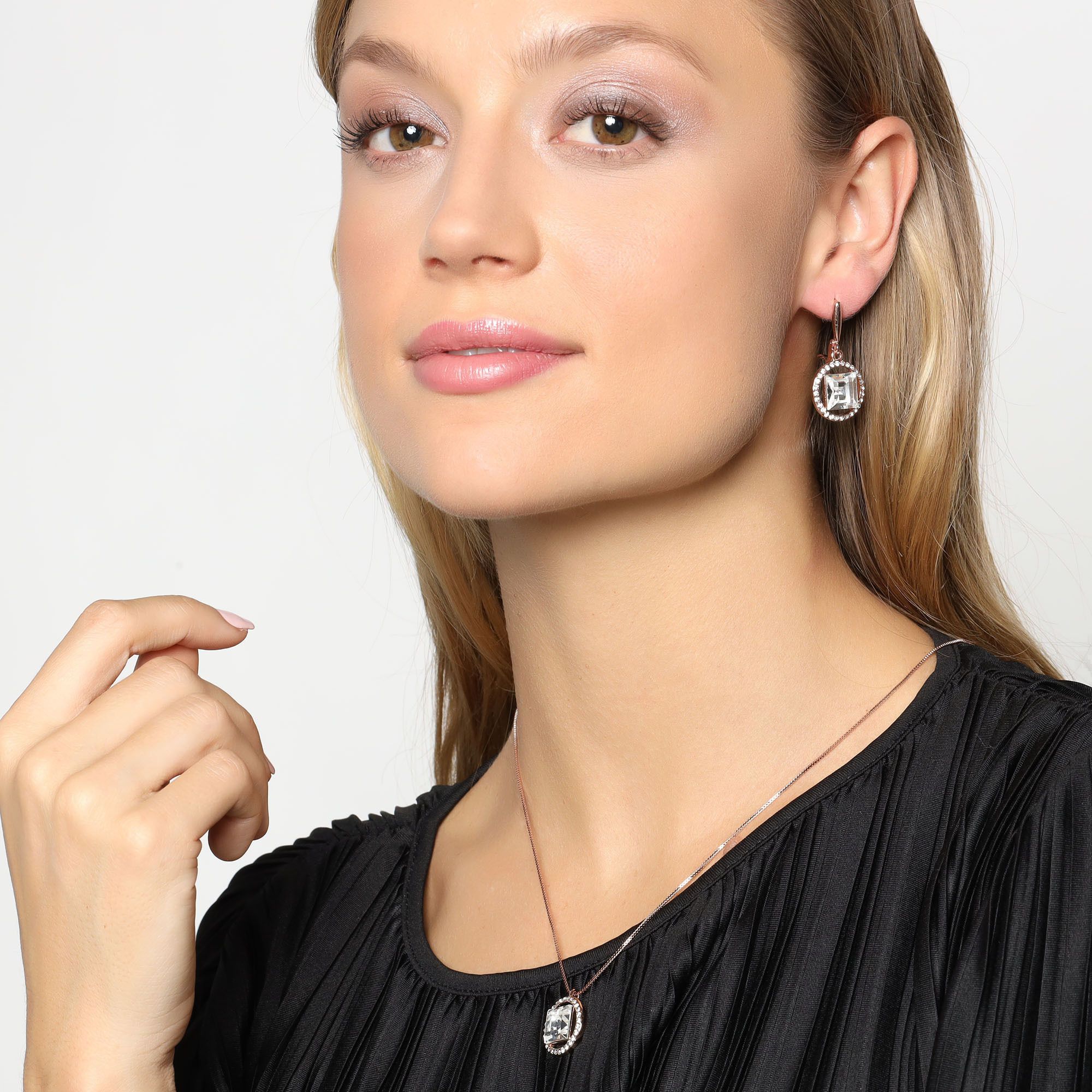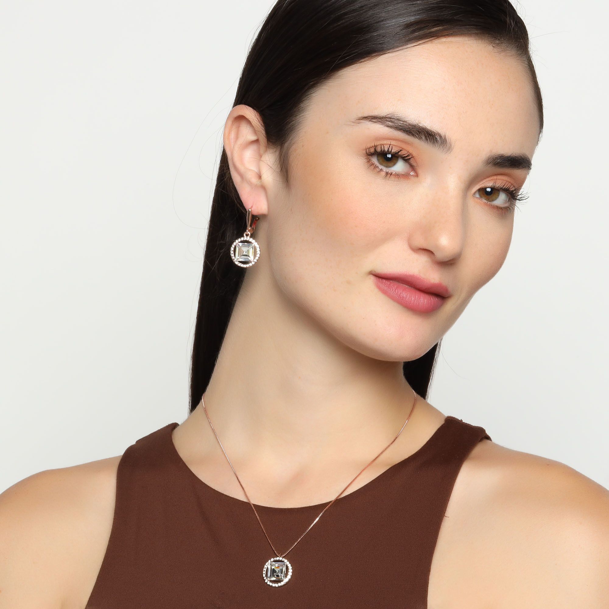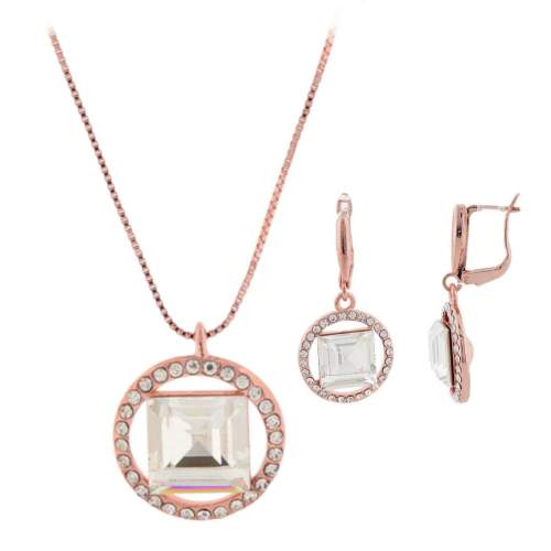 Lindo conjunto de dije con cadena y aretes en baño de oro rosa de 18 quilates, diseño geométrico con cristales blancos corte princesa e incrsutaciones de cristales blancos.