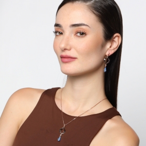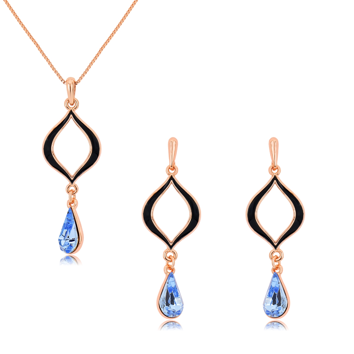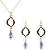 Bonito conjunto de dije con cadena y aretes en baño de oro rosa de 18 quilates, diseño de gotas con cristales azules corte pera y detalles en esmaltado color negro.