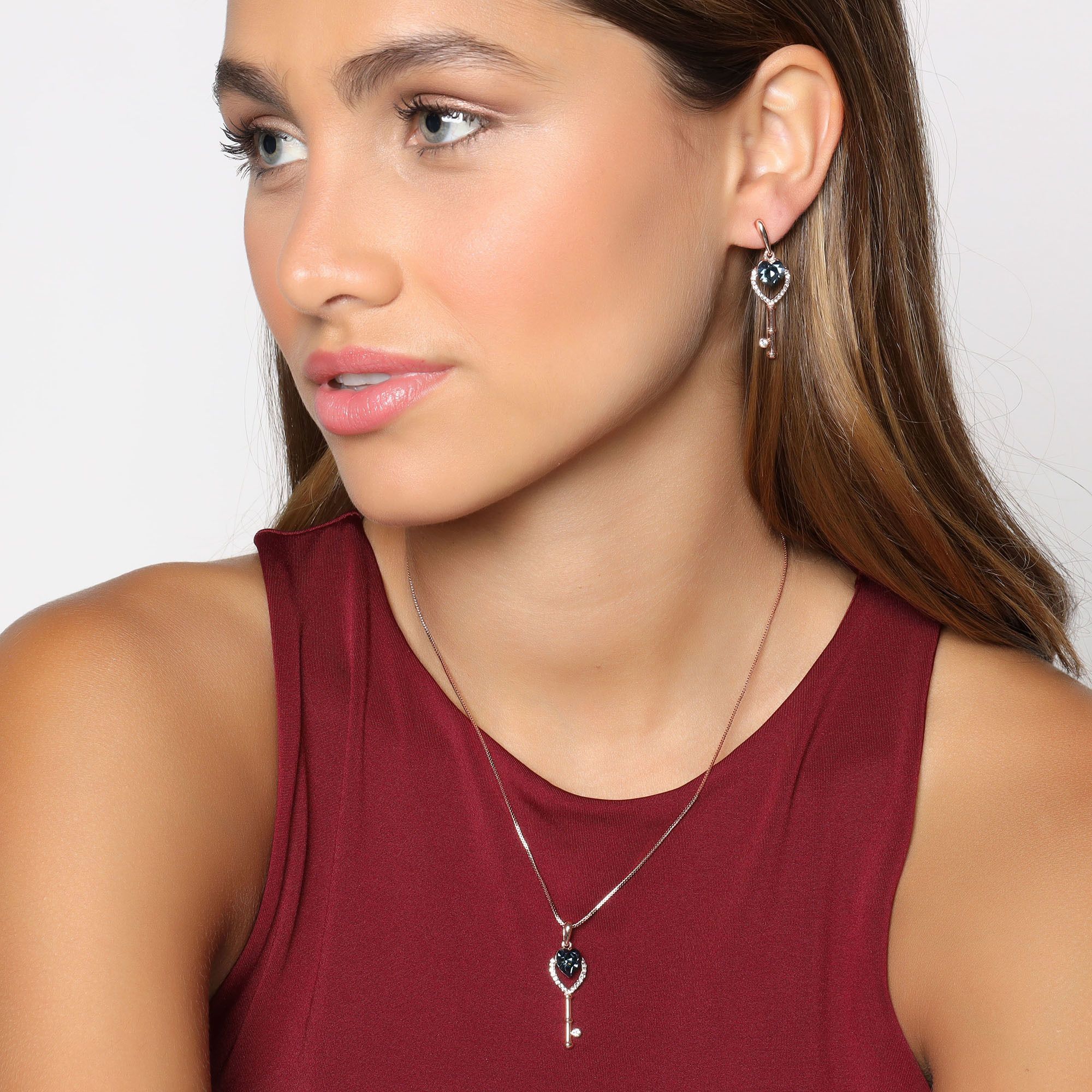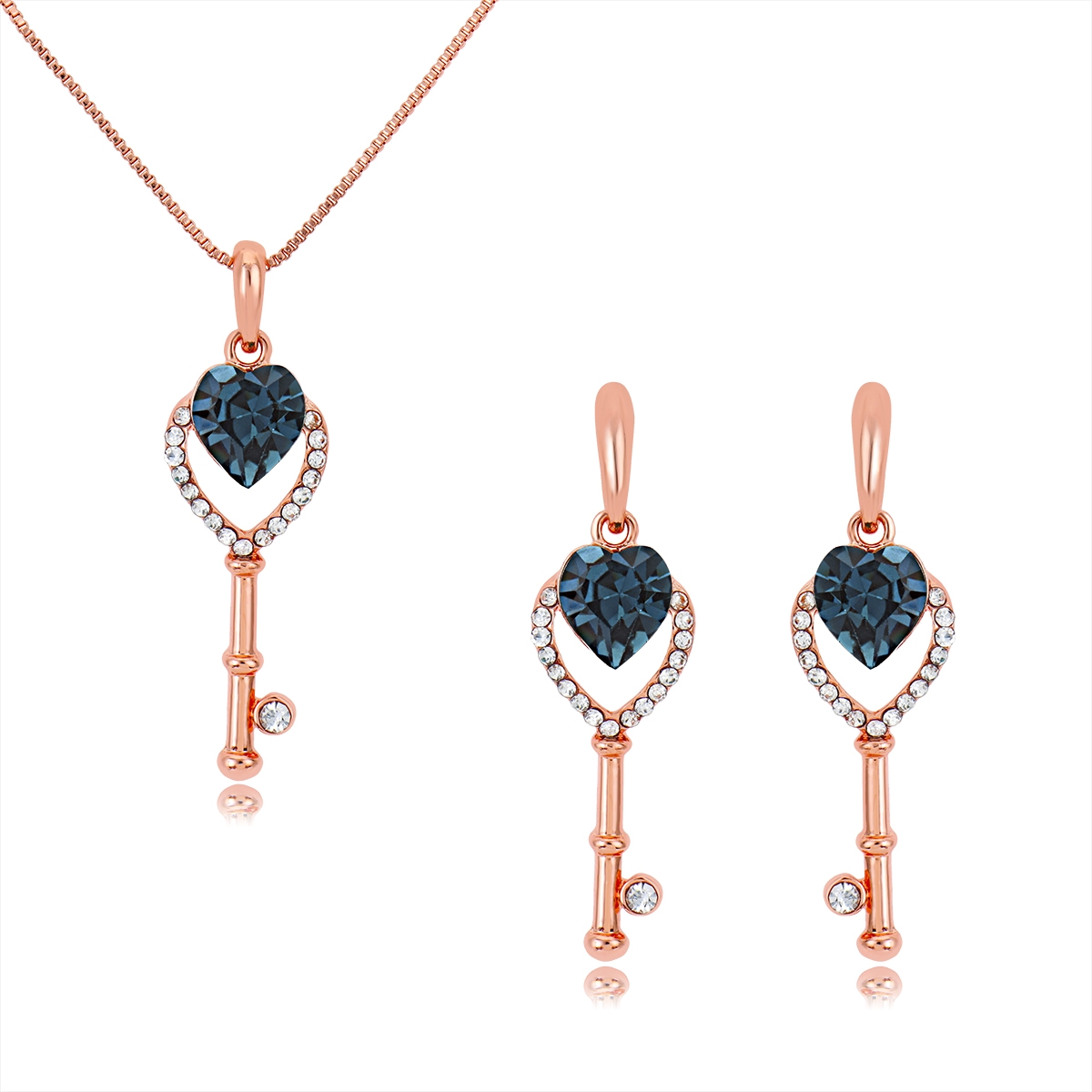 Tierno conjunto de dije con cadena y aretes en baño de oro rosa de 18 quilates, diseño de llave en forma de corazón, con cristales índigo corte corazón e incrustaciones de cristales blancos.