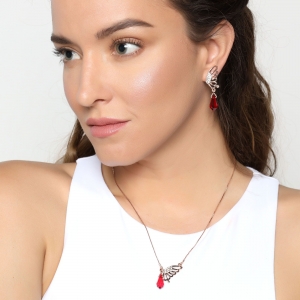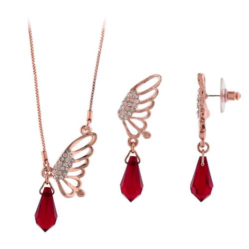 Precioso conjunto de dije con cadena y aretes en baño de oro rosa de 18 quilates, diseño de alas de mariposa, con gotas de cristales rojos corte facetado e incrustaciones de cristales blancos.