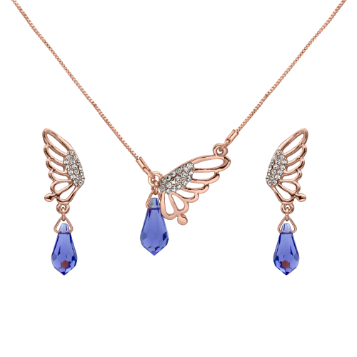 Precioso conjunto de dije con cadena y aretes en baño de oro rosa de 18 quilates, diseño de alas de mariposa, con gotas de cristales lilas corte facetado e incrustaciones de cristales blancos.