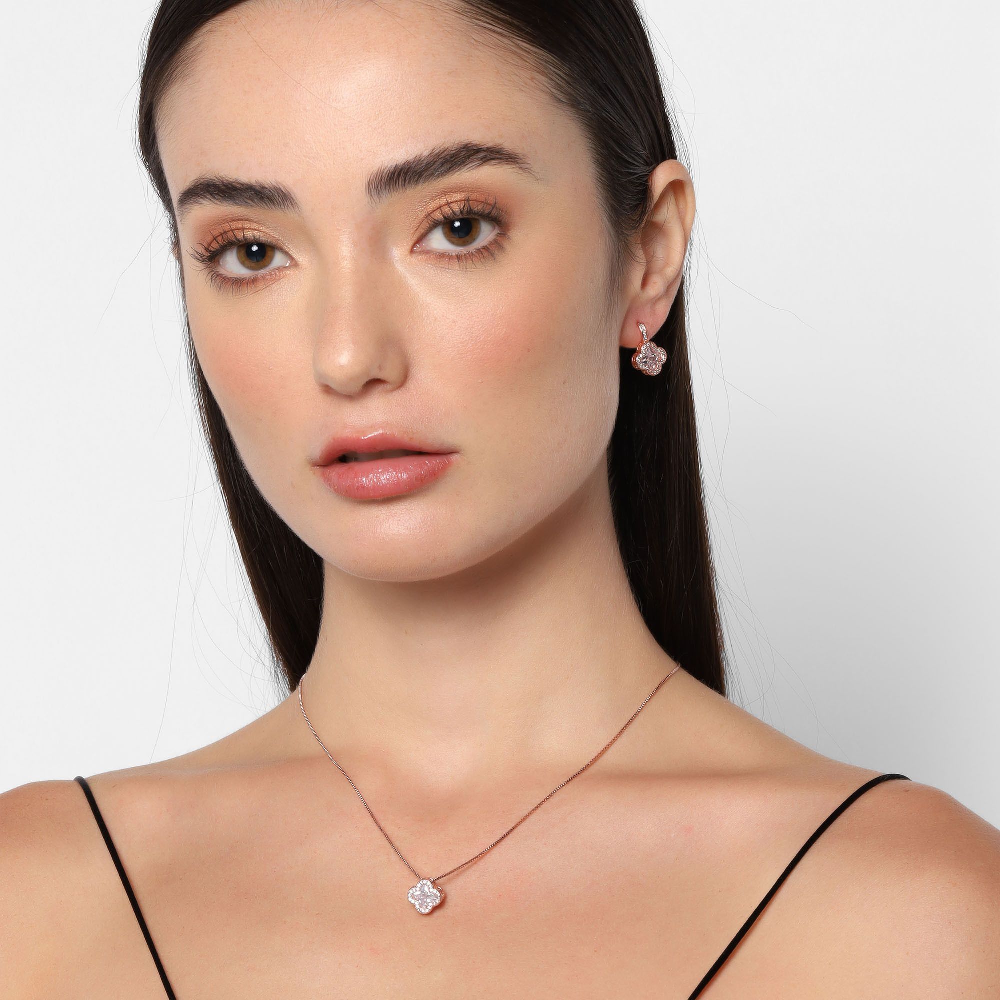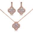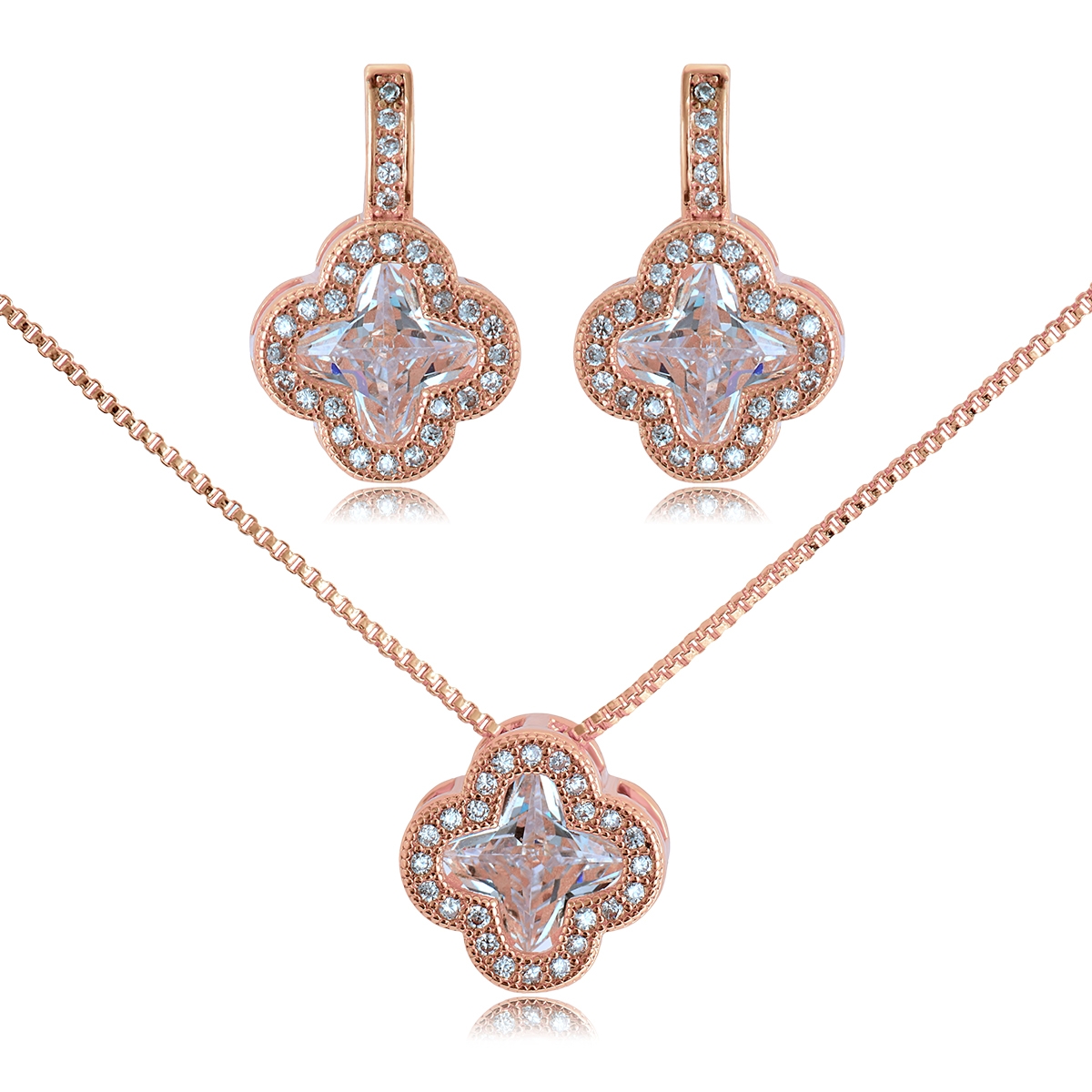 Exquisito conjunto de dije con cadena y aretes en baño de oro rosa de 18 quilates, diseño de flores en cristal blanco e incrustaciones de cristales blancos.