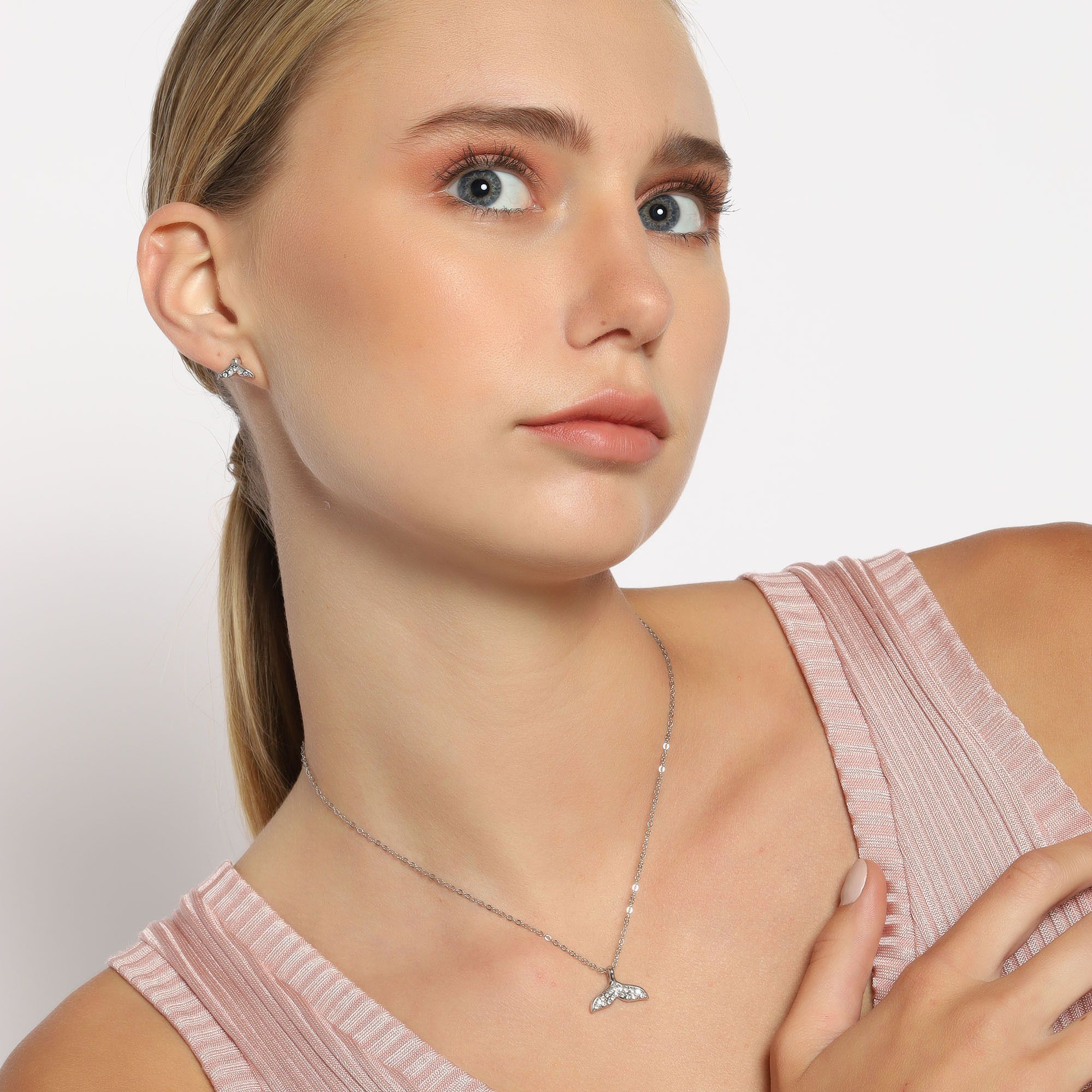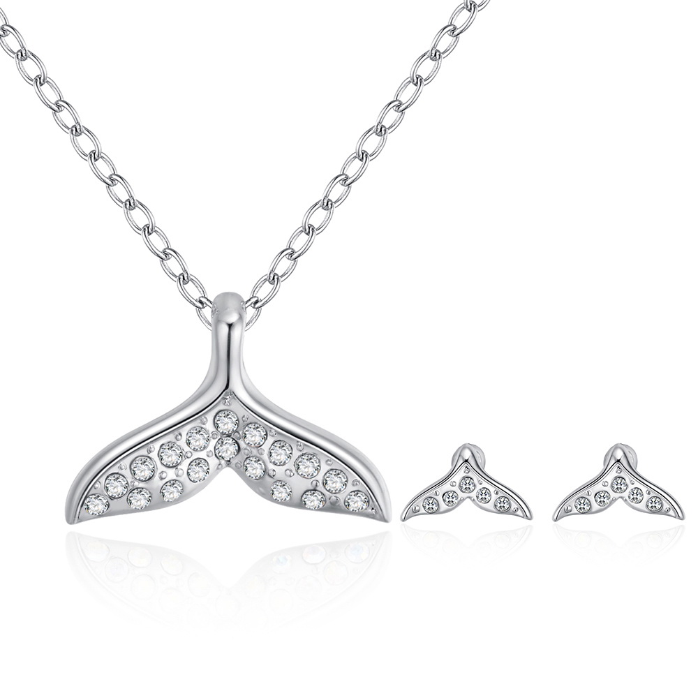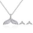 Original conjunto de dije con cadena y aretes en baño de oro blanco de 18 quilates, diseño de cola de sirena con incrustaciones de cristales blancos.
