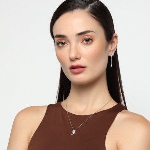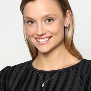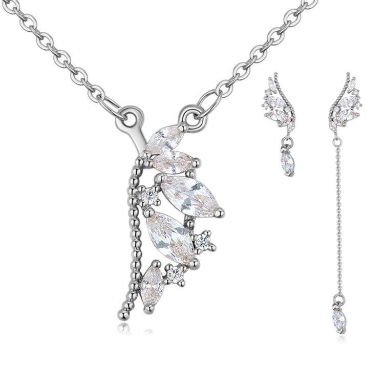 Exclusivo conjunto de dije con cadena y aretes en baño de oro blanco de 18 quilates, diseño de alas, con cristales blancos corte marquesa, incrustaciones de cristales blancos y detalles en relieve.