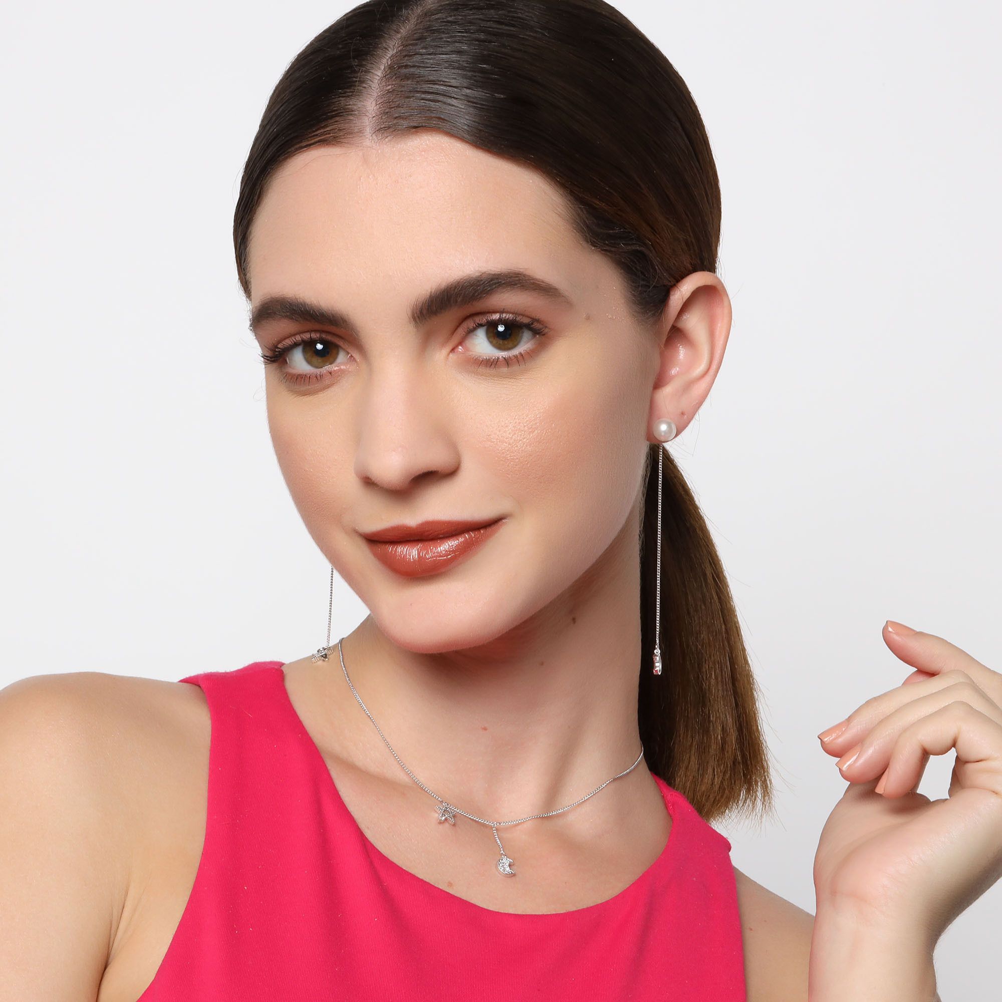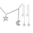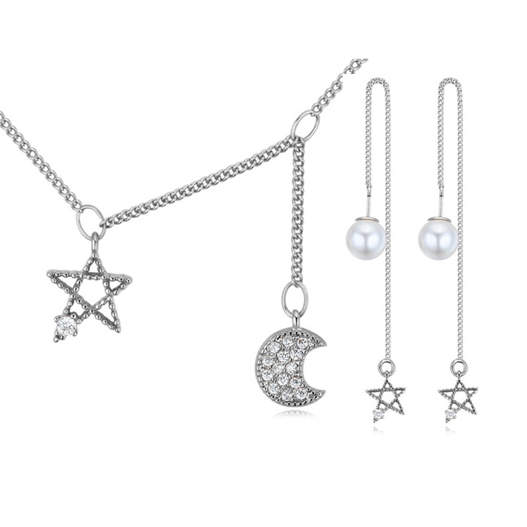 Moderno conjunto de dije con cadena y pendientes en baño de oro blanco de 18 quilates, diseño de luna y estrellas con perlas blancas e incrustaciones de cristales blancos.