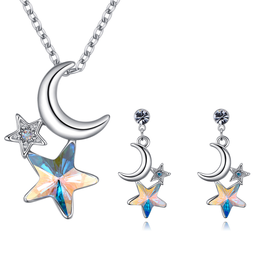 Hermoso conjunto de dije con cadena y aretes en baño de oro blanco de 18 quilates, diseño de luna y estrellas en cristal tornasol con incrustaciones de cristales blancos y tornasol corte brillante.