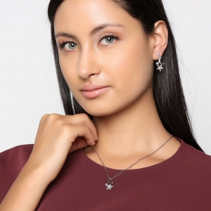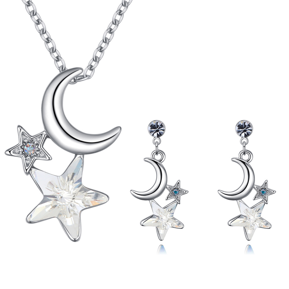Hermoso conjunto de dije con cadena y aretes en baño de oro blanco de 18 quilates, diseño de luna y estrellas en cristal blanco con incrustaciones de cristales blancos y tornasol corte brillante.