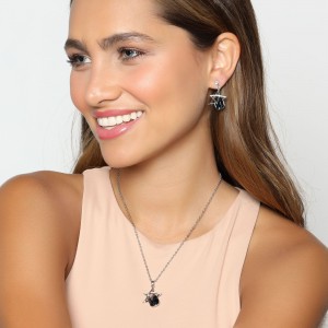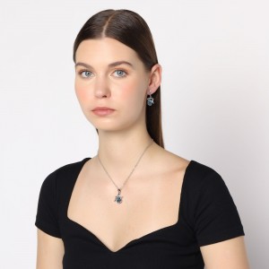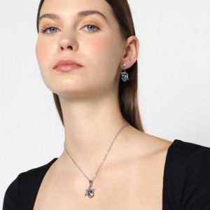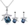Bello conjunto de dije con cadena y aretes en baño de oro blanco de 18 quilates, diseño de estrellas con cristal azul marino corte esmeralda e incrustaciones de cristales blancos.