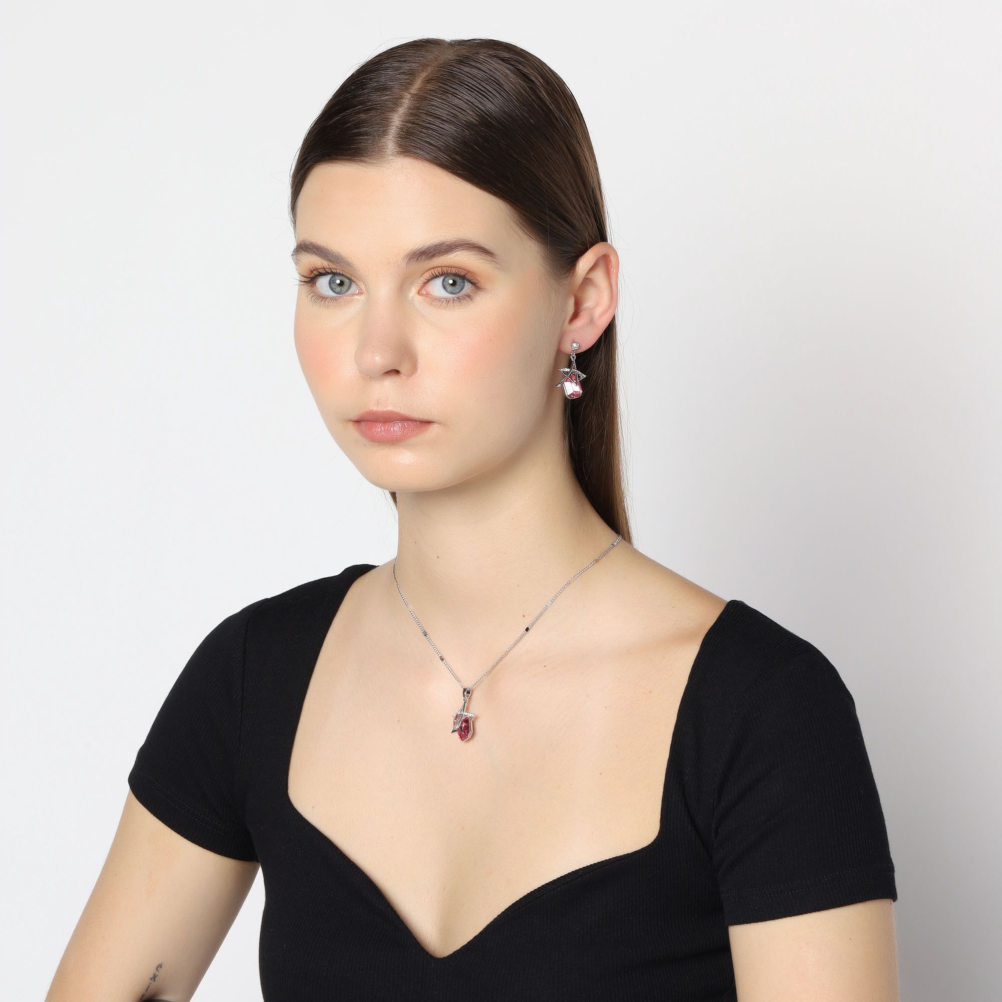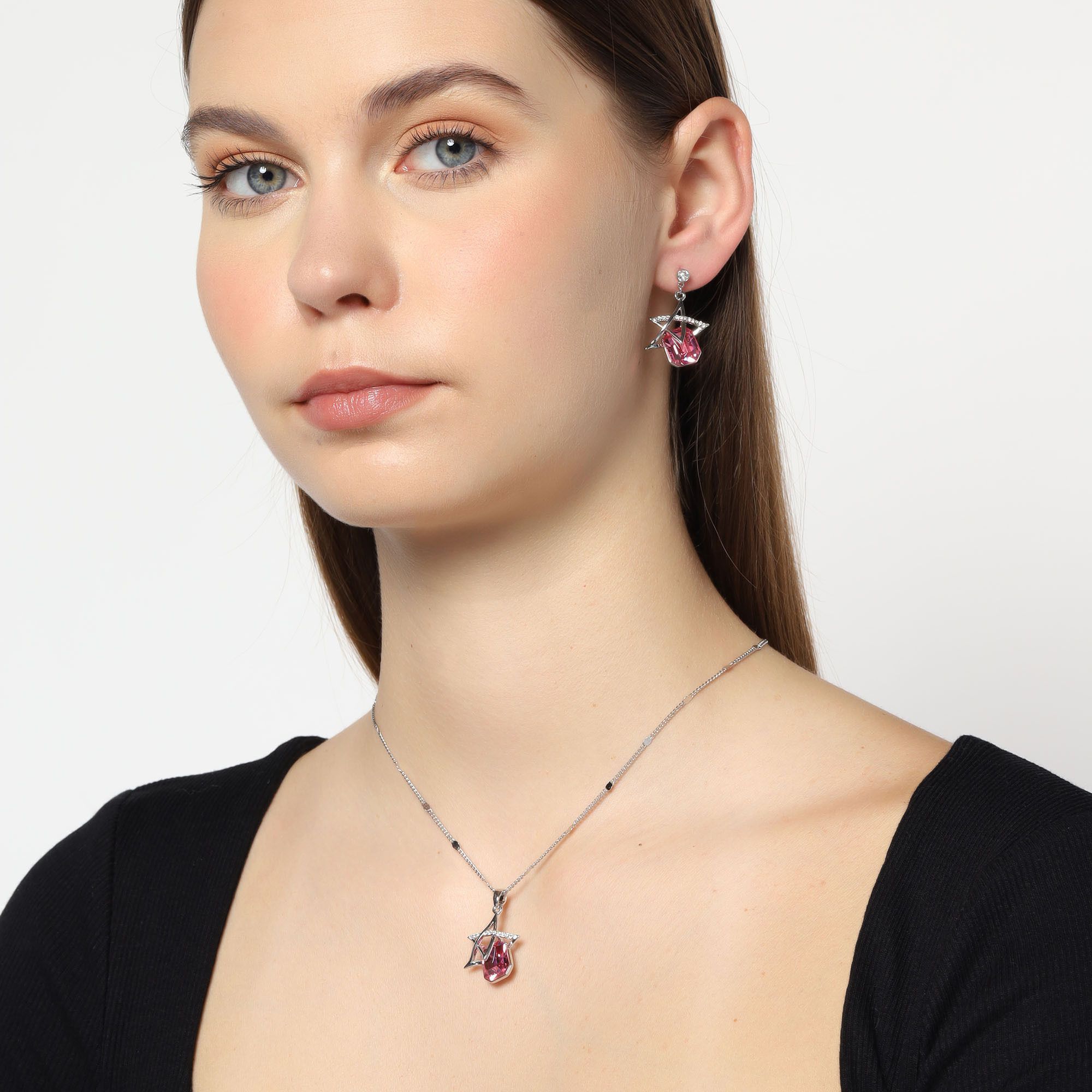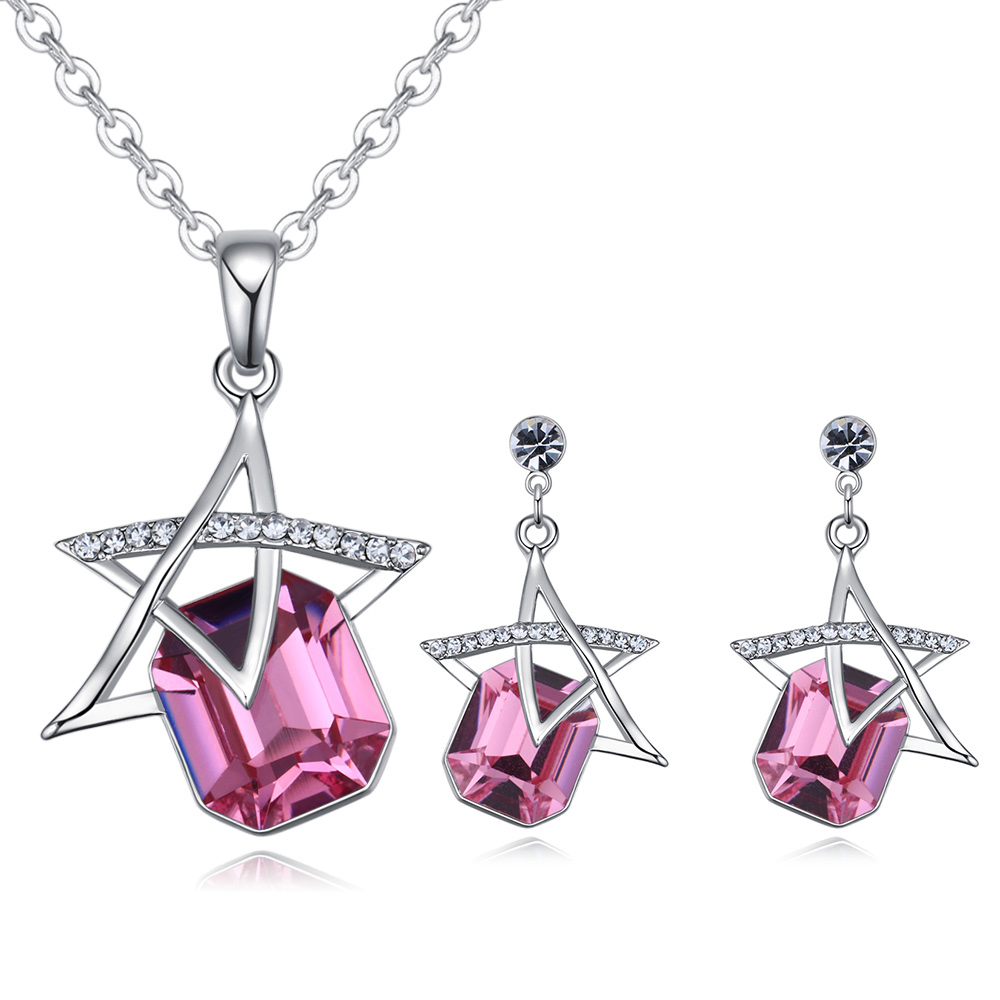 Bello conjunto de dije con cadena y aretes en baño de oro blanco de 18 quilates, diseño de estrellas con cristal fucsia corte esmeralda e incrustaciones de cristales blancos.