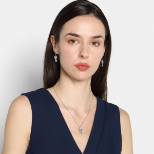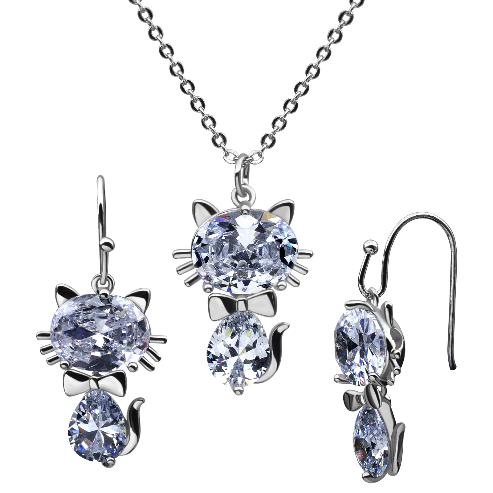 Tierno conjunto de collar y aretes en ba�o de oro blanco, dise�o de gato con cristales en color blanco.