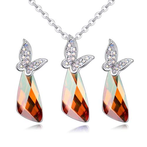 Elegante conjunto de dije y aretes en baño de oro blanco de 18 quilates, fino diseño de mariposas con incrustaciones de cristales en color blanco y cristal en color ámbar.