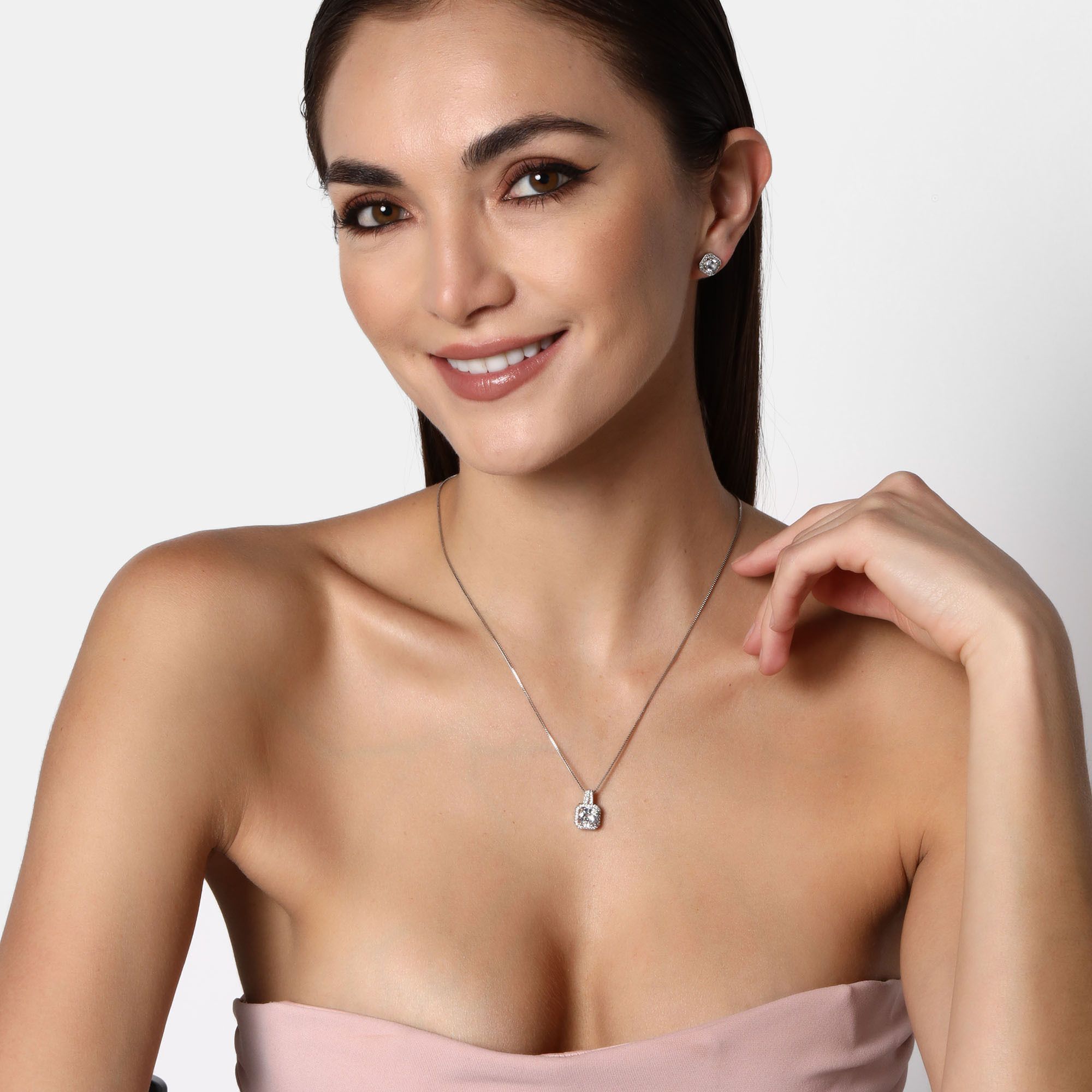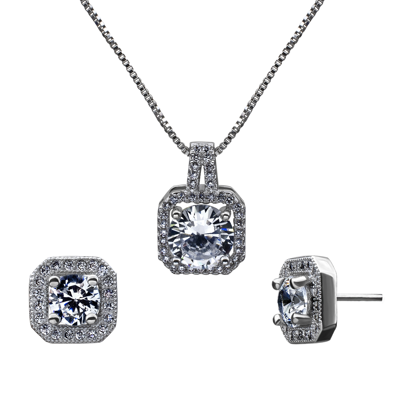 Hermoso conjunto de collar y aretes en baño de oro blanco de 18 quilates, fino diseño cuadrado con incrustaciones de cristales en color blanco.
