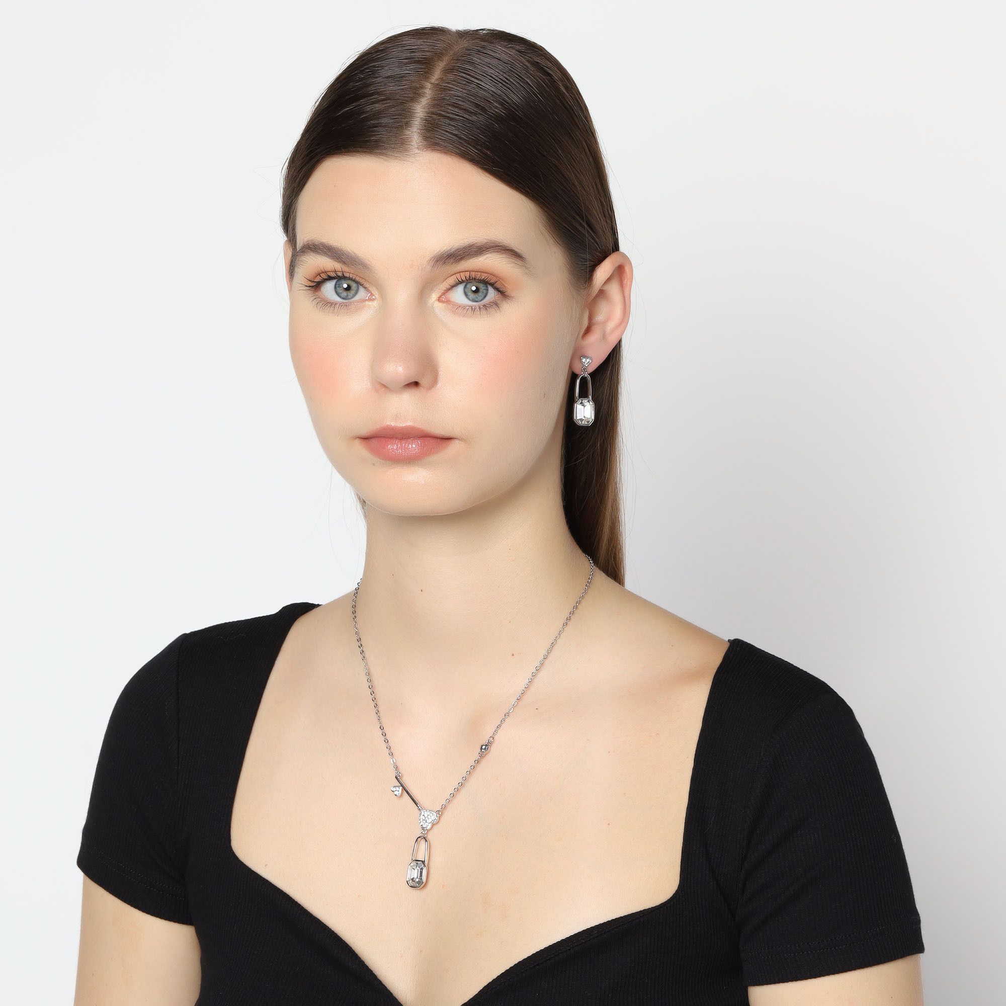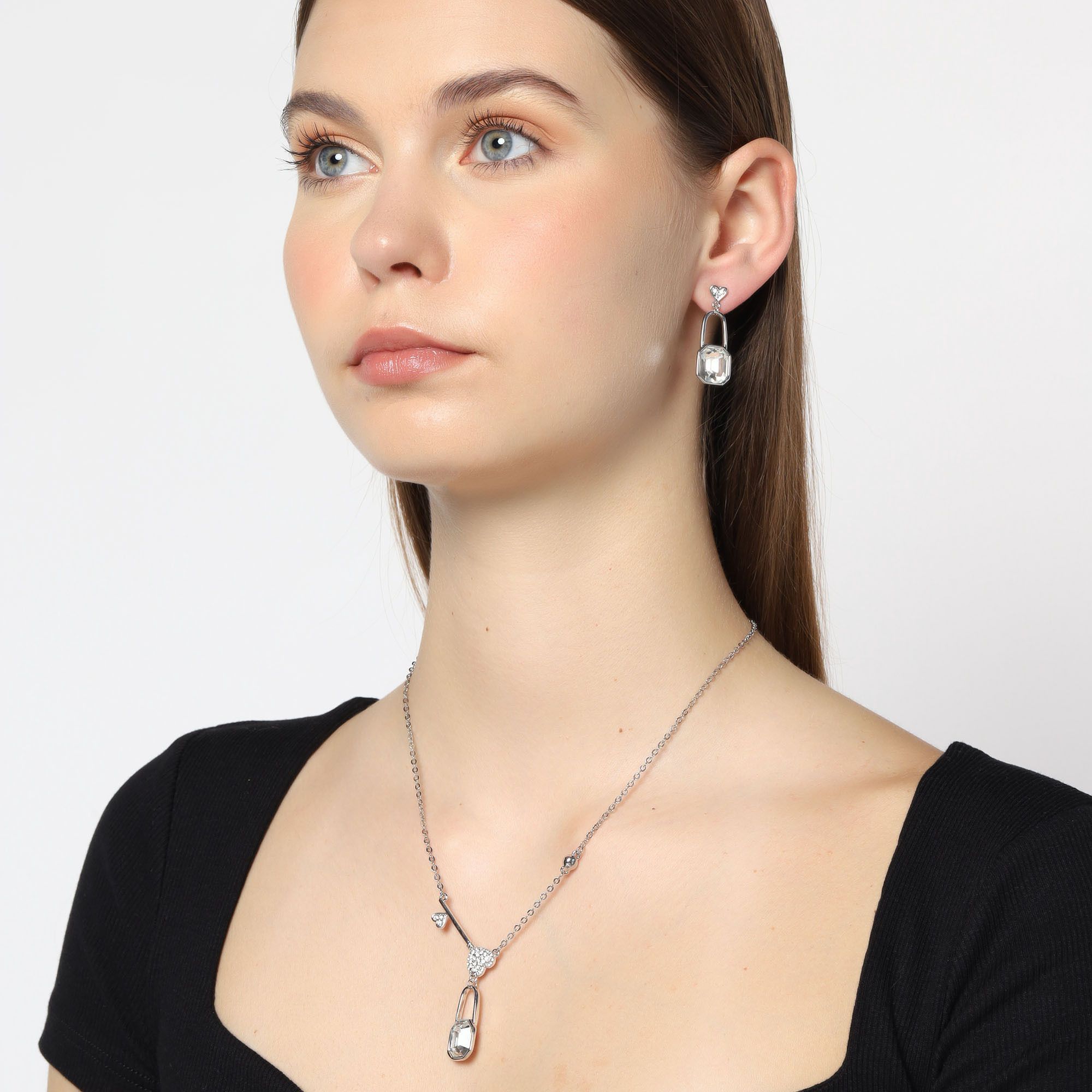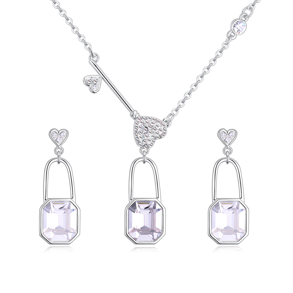 Tierno conjunto de collar y aretes en baño de oro blanco de 18 quilates, diseño de candado con llave en el dije y candado en aretes con corazones e incrustaciones de cristales en color blanco.
