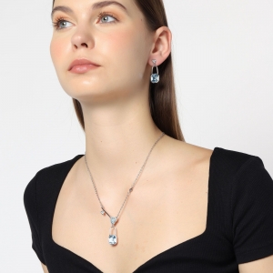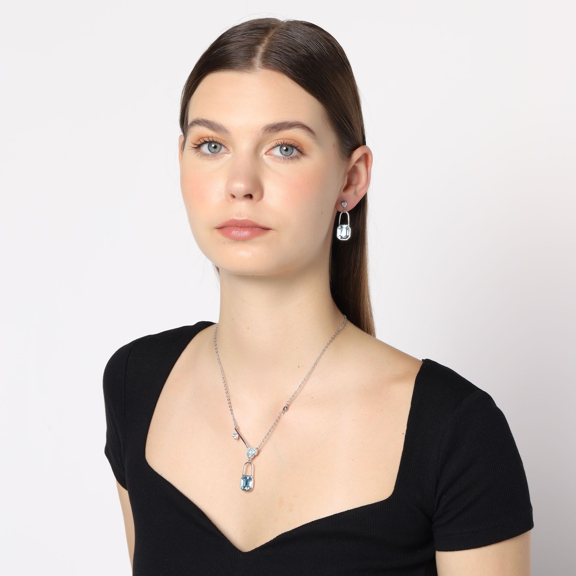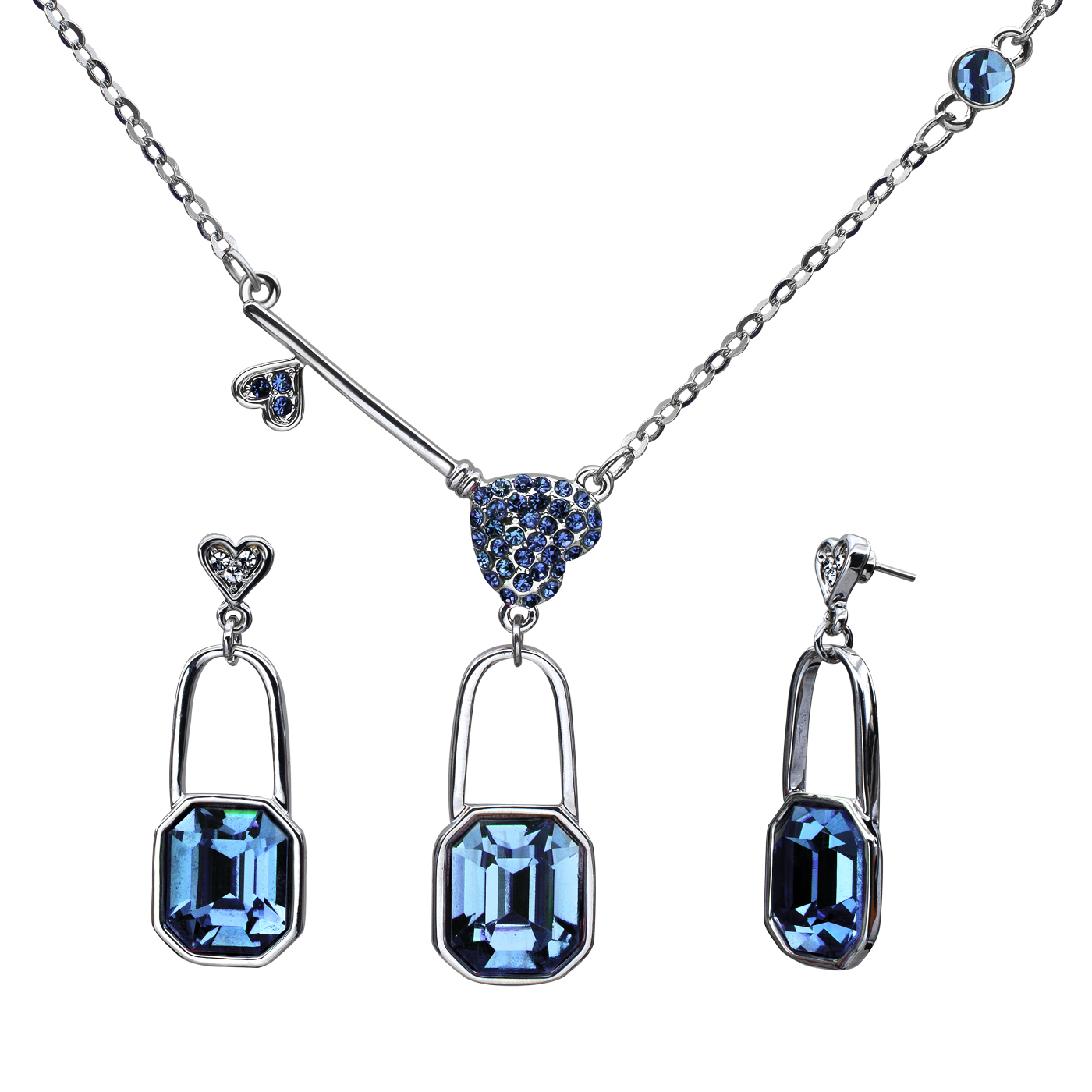 Tierno conjunto de collar y aretes en baño de oro blanco de 18 quilates, diseño de candado con llave en el dije y candado en aretes con corazones e incrustaciones de cristales en color azul.
