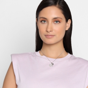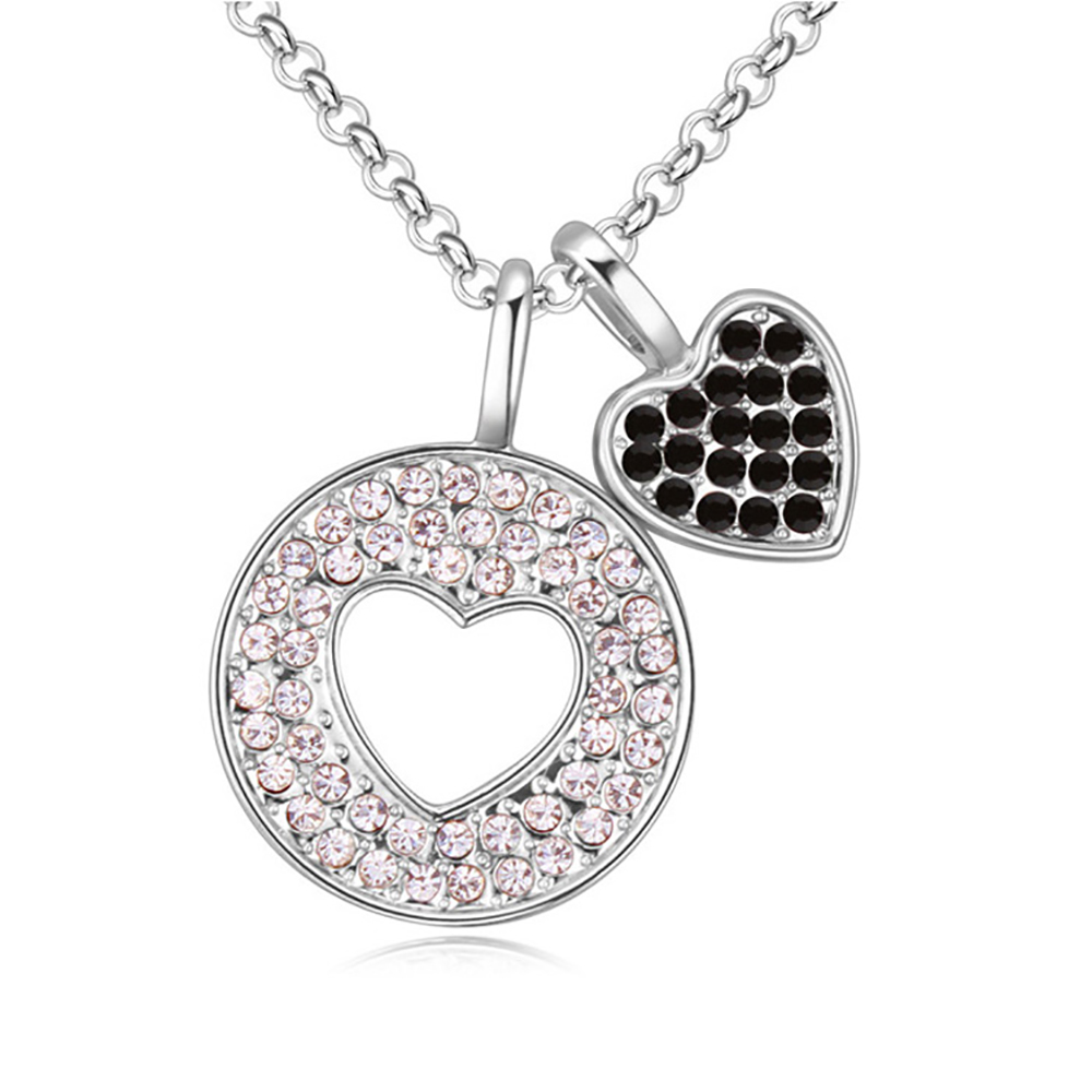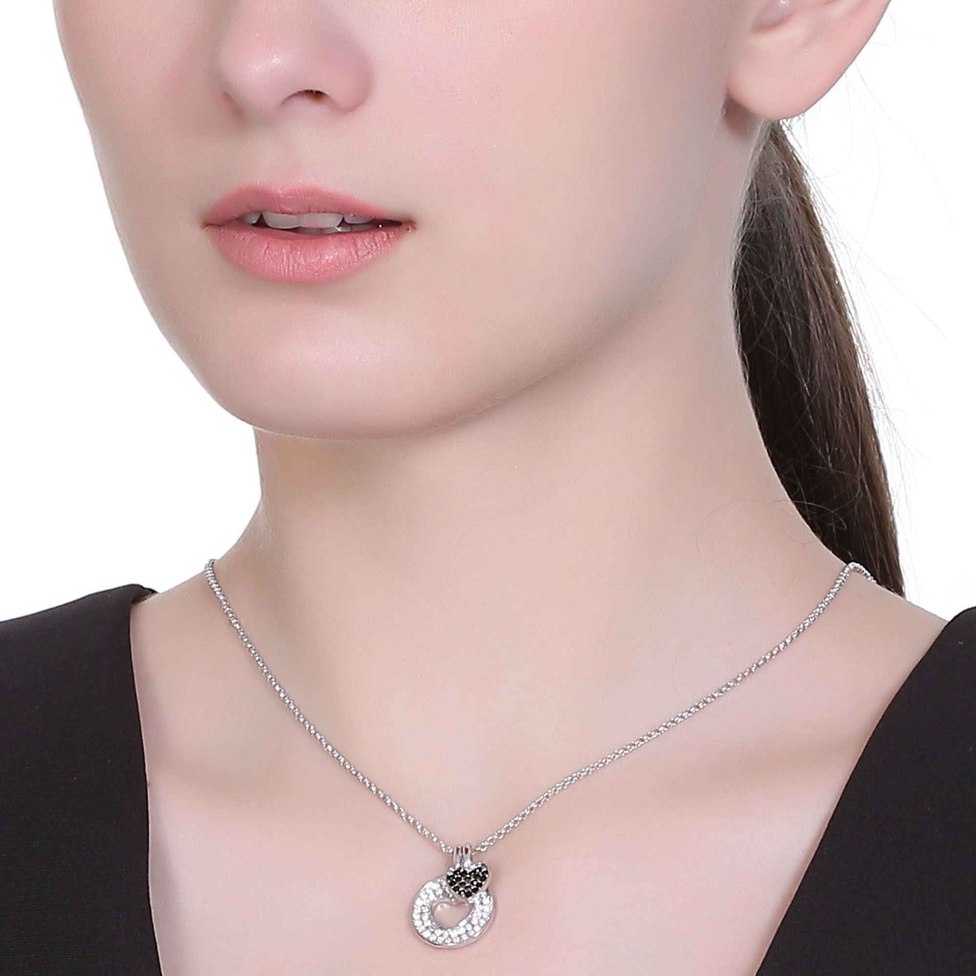 Dije con cadena en baño de oro blanco de 18 quilates, diseño de círculo con figura de corazón al centro, dije de corazón e incrustaciones de cristales en color blanco y negro.