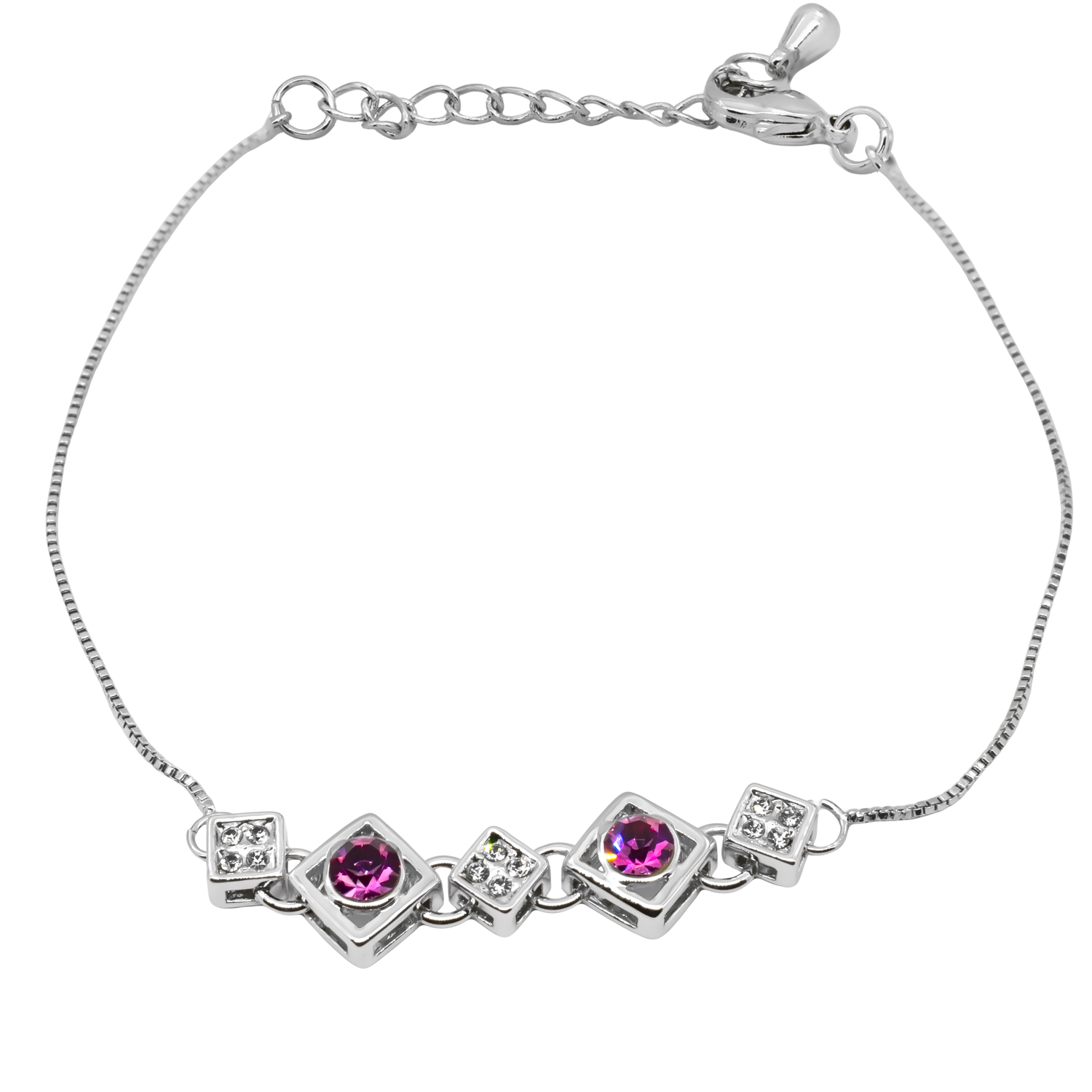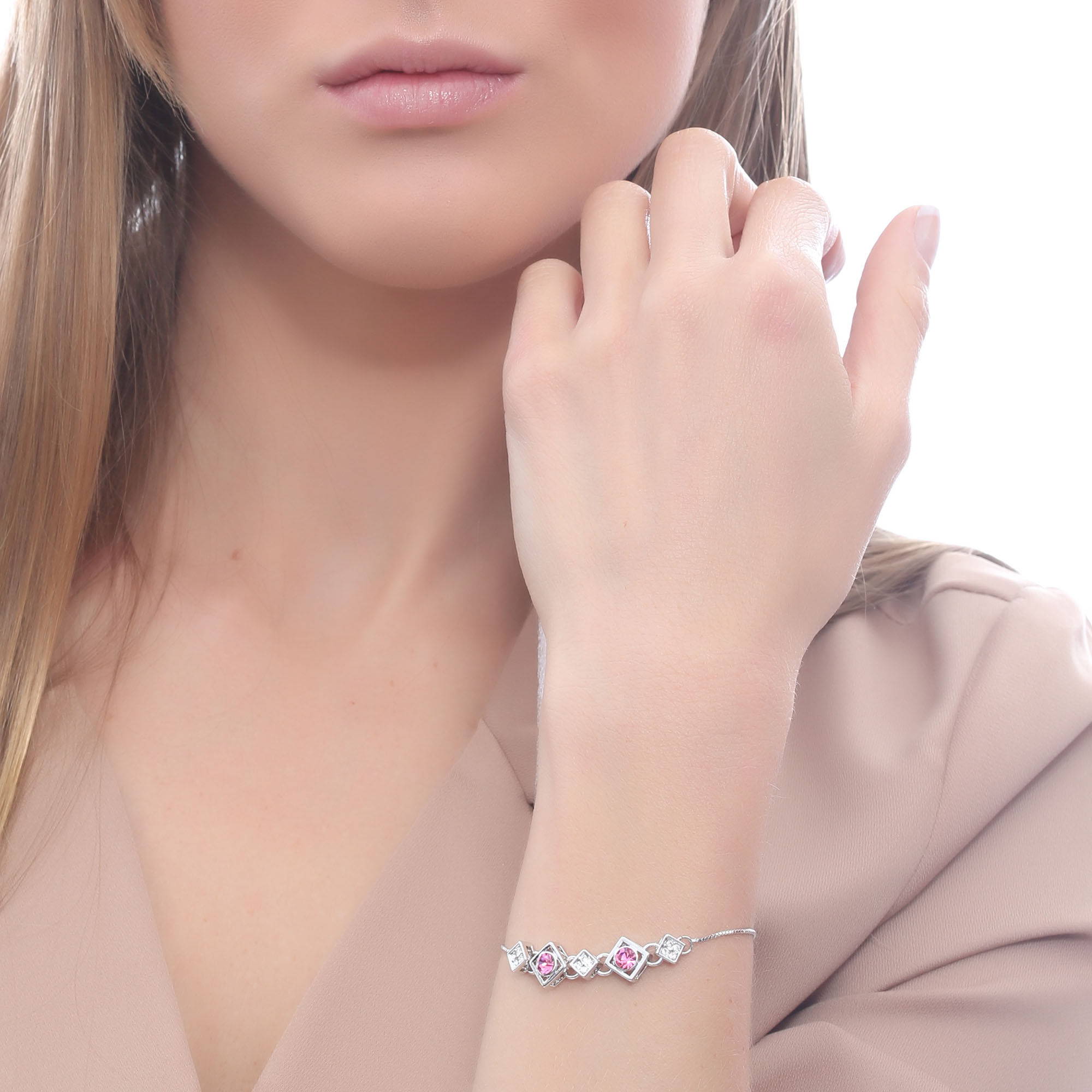 Pulsera en baño de oro blanco de 18 quilates, fino diseño, con incrustación de cristales en color blanco y rosa. Fabricado en una estructura de aleación de platino con rodio sin níquel
