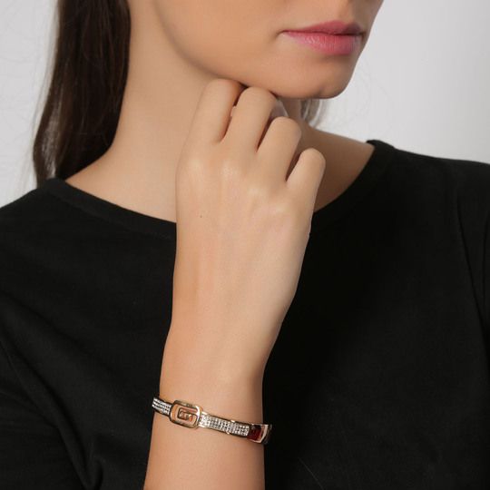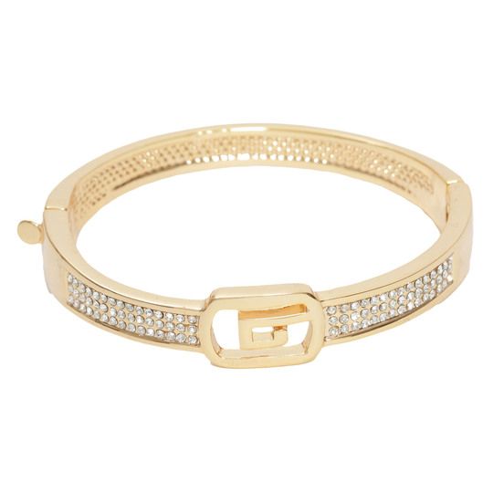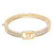 Hermosa pulsera, en baño de oro amarillo de 18 quilates, exquisito diseño, en forma de cinturón, con hebilla e incrustaciones de cristales en color blanco. Fabricado en una estructura de aleación de platino con rodio sin níquel.