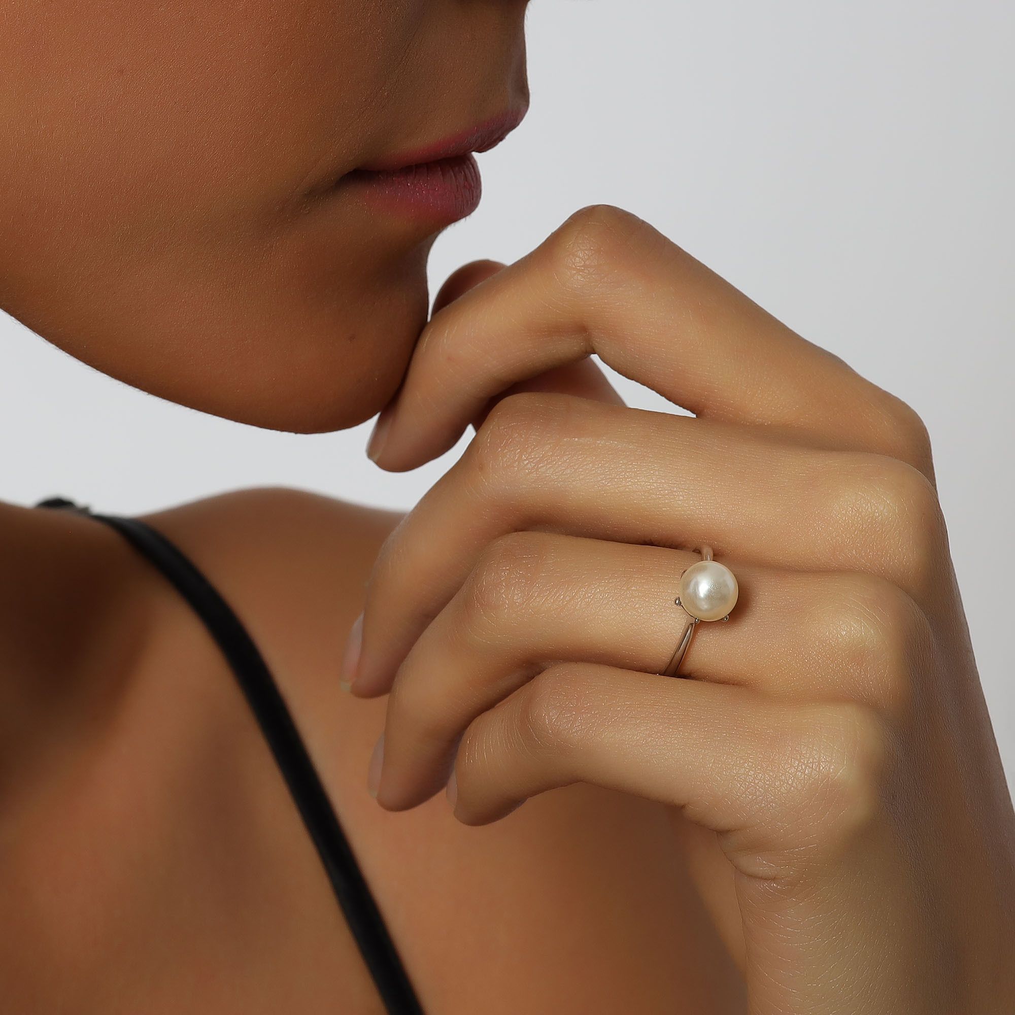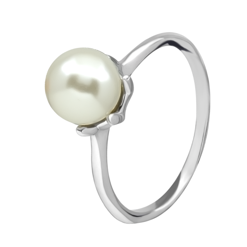 Anillo en baño de oro blanco de 18 quilates, fino diseño, con detalle de perla blanca.