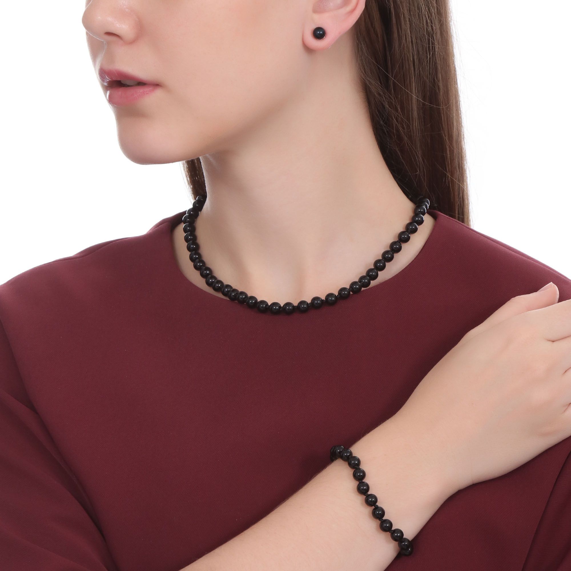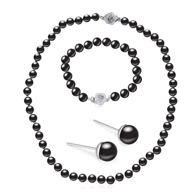 Juego de aretes, pulsera y dije con perlas en color negro, detalle de pequeñas rosas en baño de oro blanco de 18 quilates,