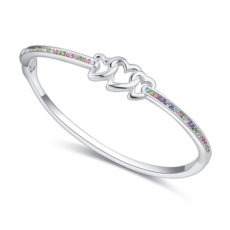 Delicado brazalete, en baño de oro blanco de 18 quilates, diseño de corazones entrelazados, con incrustaciones de cristales en color morado, rosa, verde y blanco.