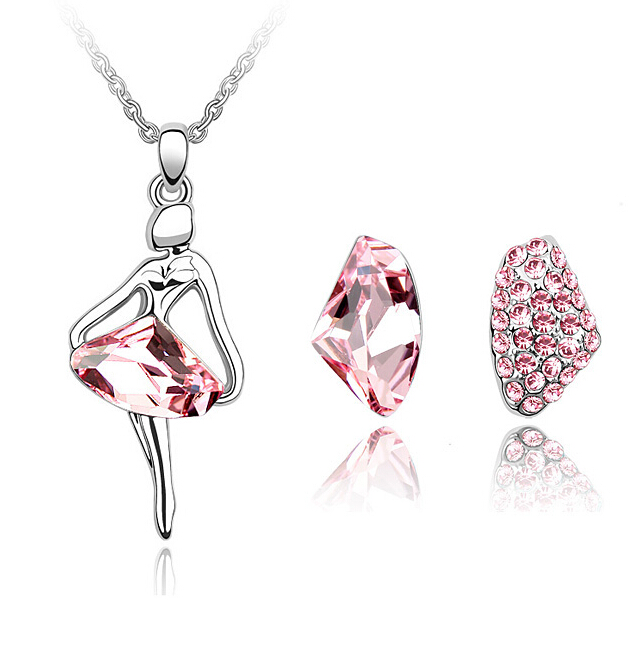 Juego de aretes y dije en baño de oro blanco de 18 quilates, diseño de bailarina con incrustación de cristales en color rosa.