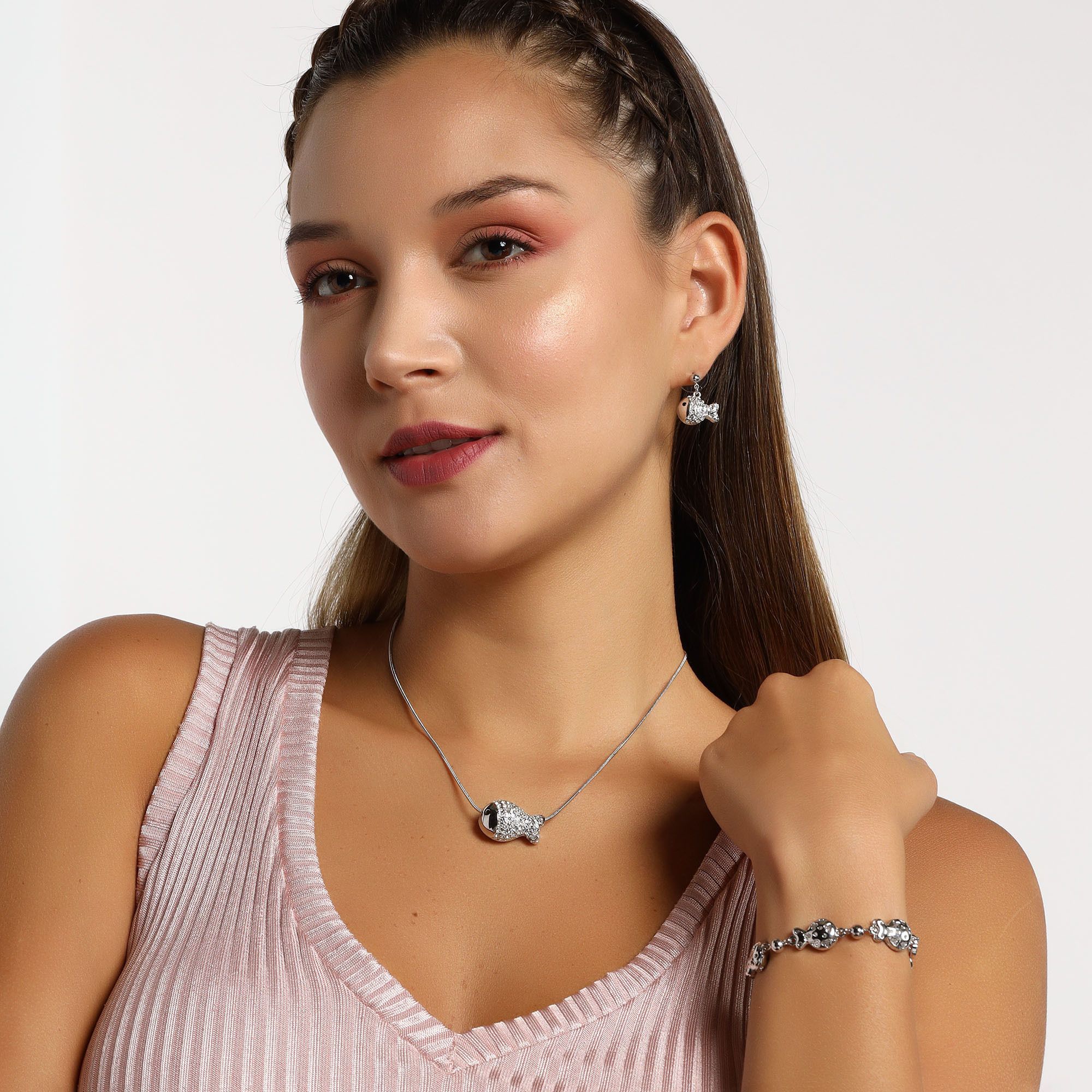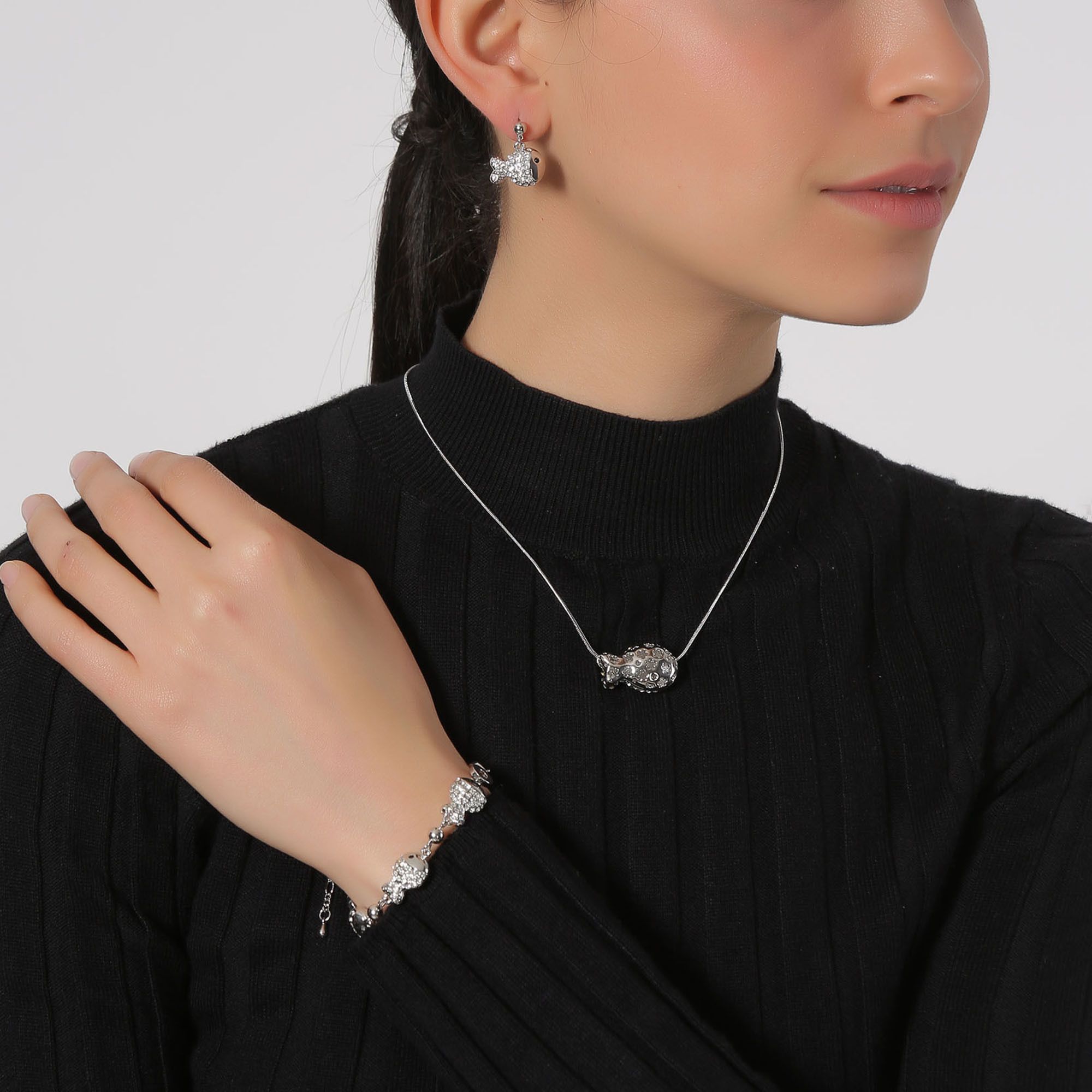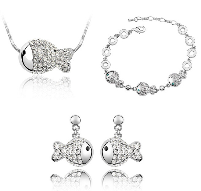 Juego de aretes, pulsera y dije en baño de oro blanco de 18 quilates, diseño de peces con incrustación de cristales en color blanco.