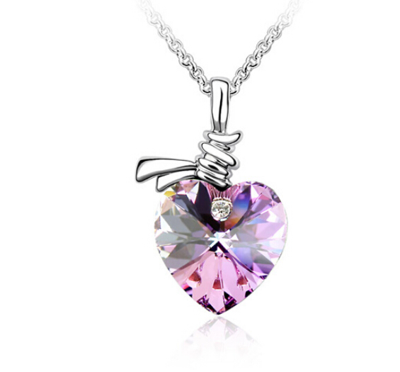 Dije con cadena en baño de oro blanco de 18 quilates, diseño de corazón en cristal morado e incrustación de cristal blanco.