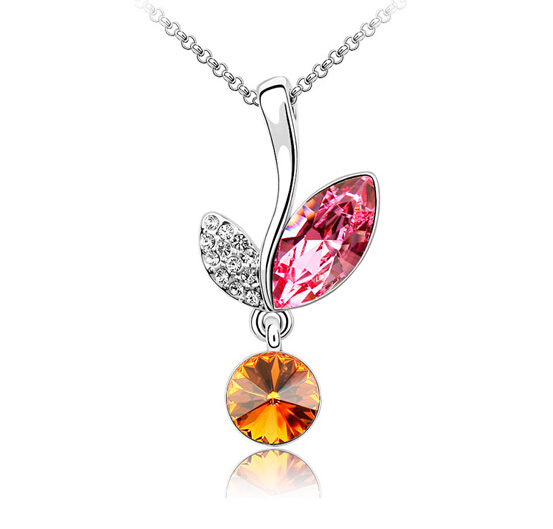 Dije con cadena en baño de oro blanco de 18 quilates, diseño de cereza con cristal corte marquesa color rosa, cristal corte redondo en ámbar e incrustaciones de cristales blancos.