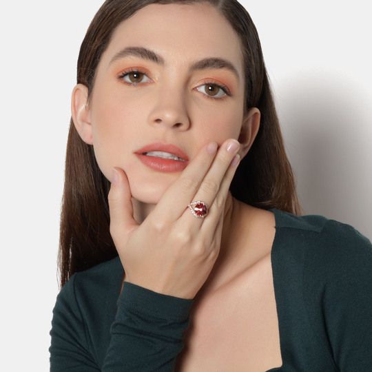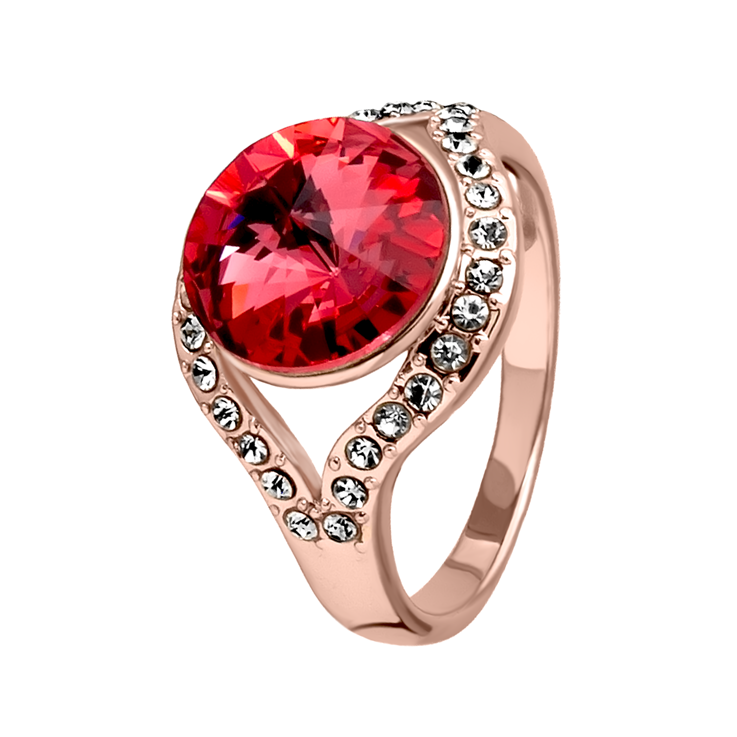 Anillo en baño de oro amarillo de 18 quilates, bello diseño, con cristal rojo corte circular e incrustaciones de cristales blancos.