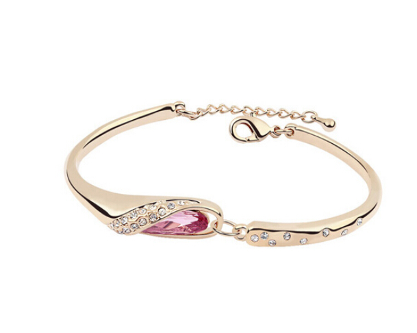 Brazalete en baño de oro amarillo de 18 quilates, lindo diseño, con cristal rosa corte oval e incrustaciones de cristales blancos.