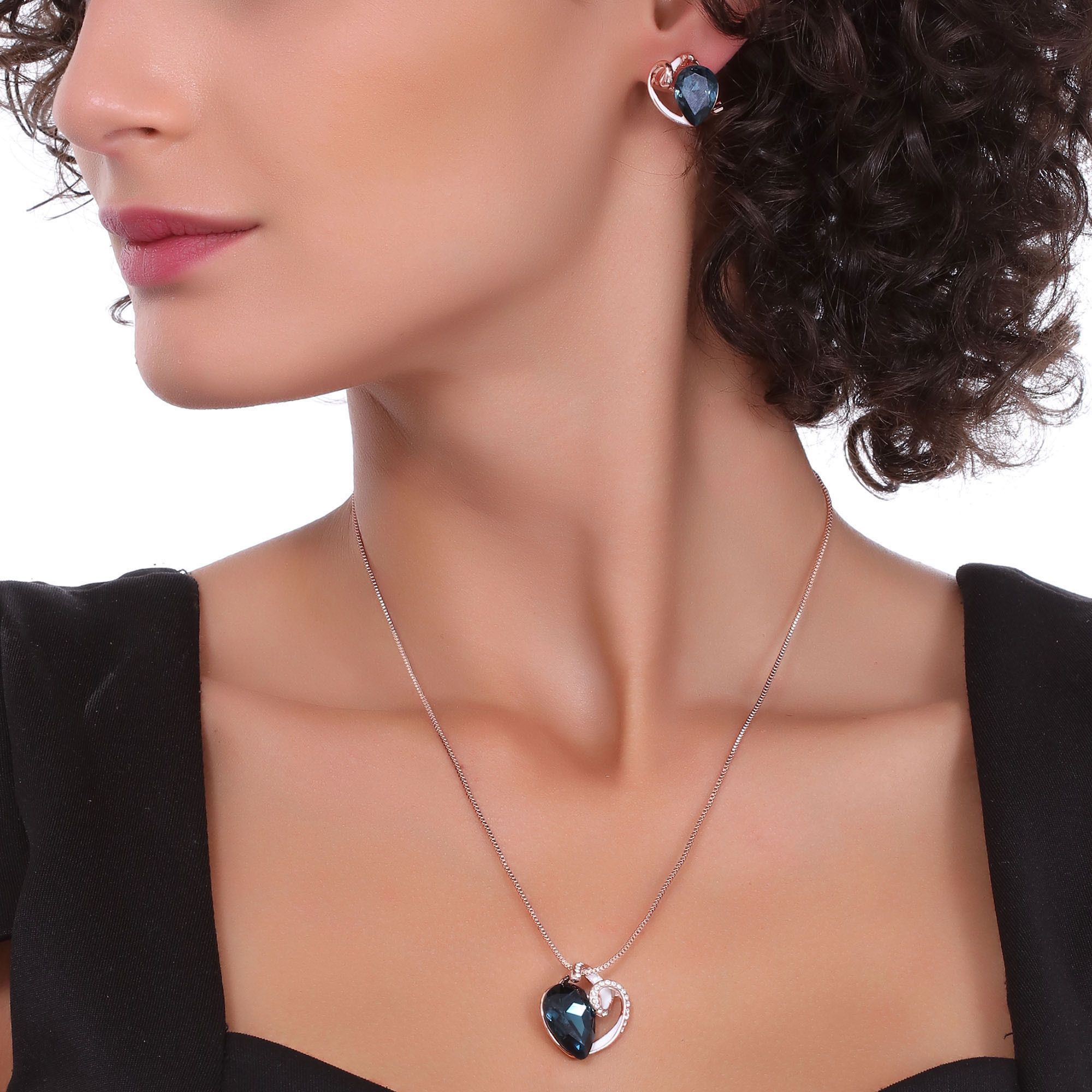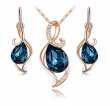 Juego de aretes y dije en baño de oro rosa de 18 quilates, diseño de espirales con incrustación de cristales en color azul y blanco.
