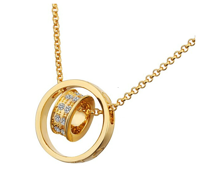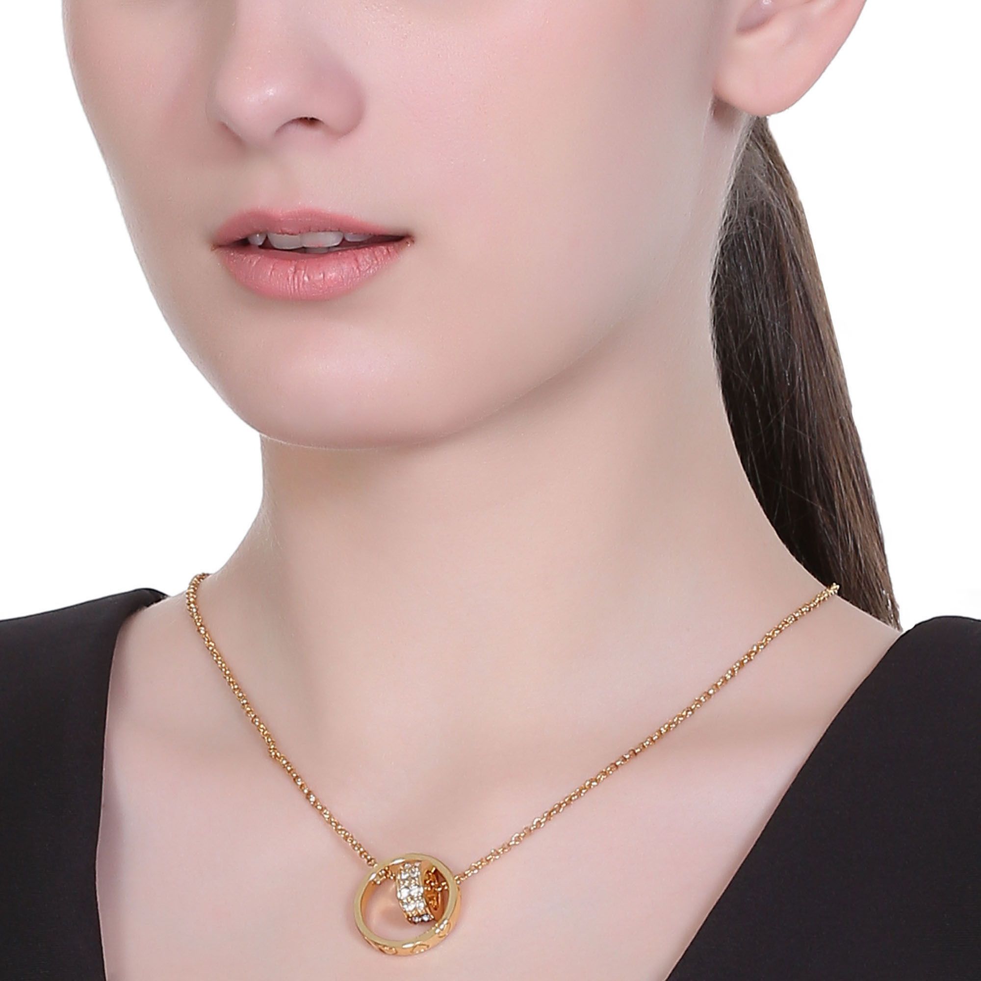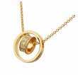 Dije con cadena en baño de oro amarillo de 18 quilates, diseño de aros, con grabado de corazones e incrustaciones de cristales blancos.
