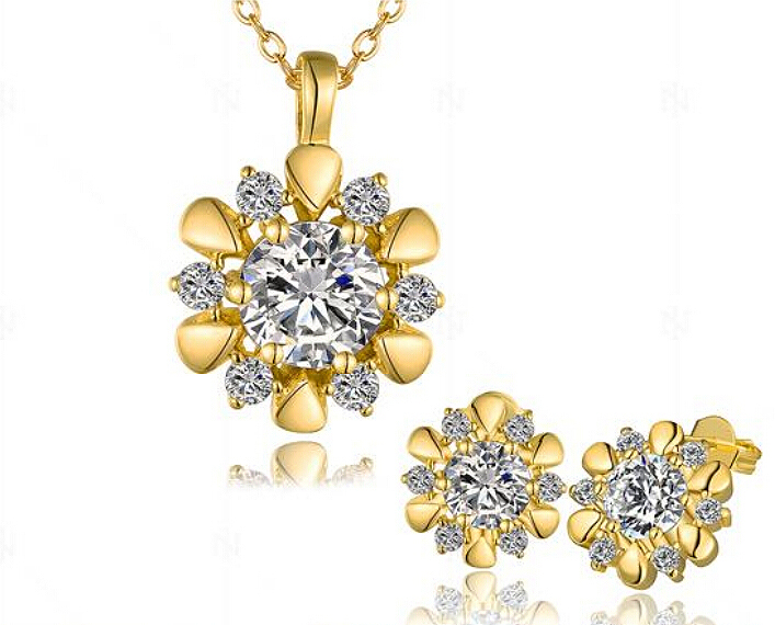 Juego de aretes y dije en baño de oro amarillo de 18 quilates, con incrustación de cristales en color blanco.
