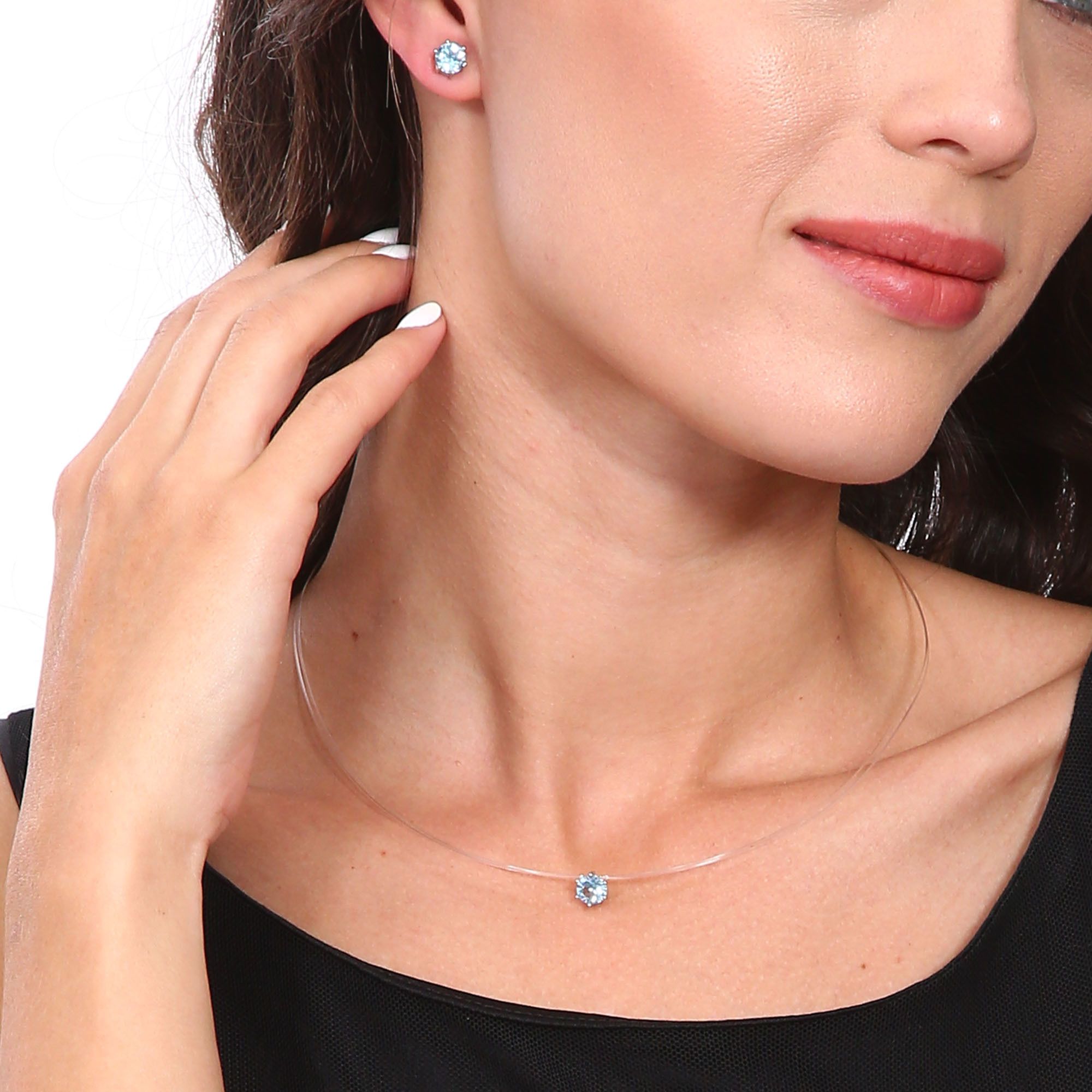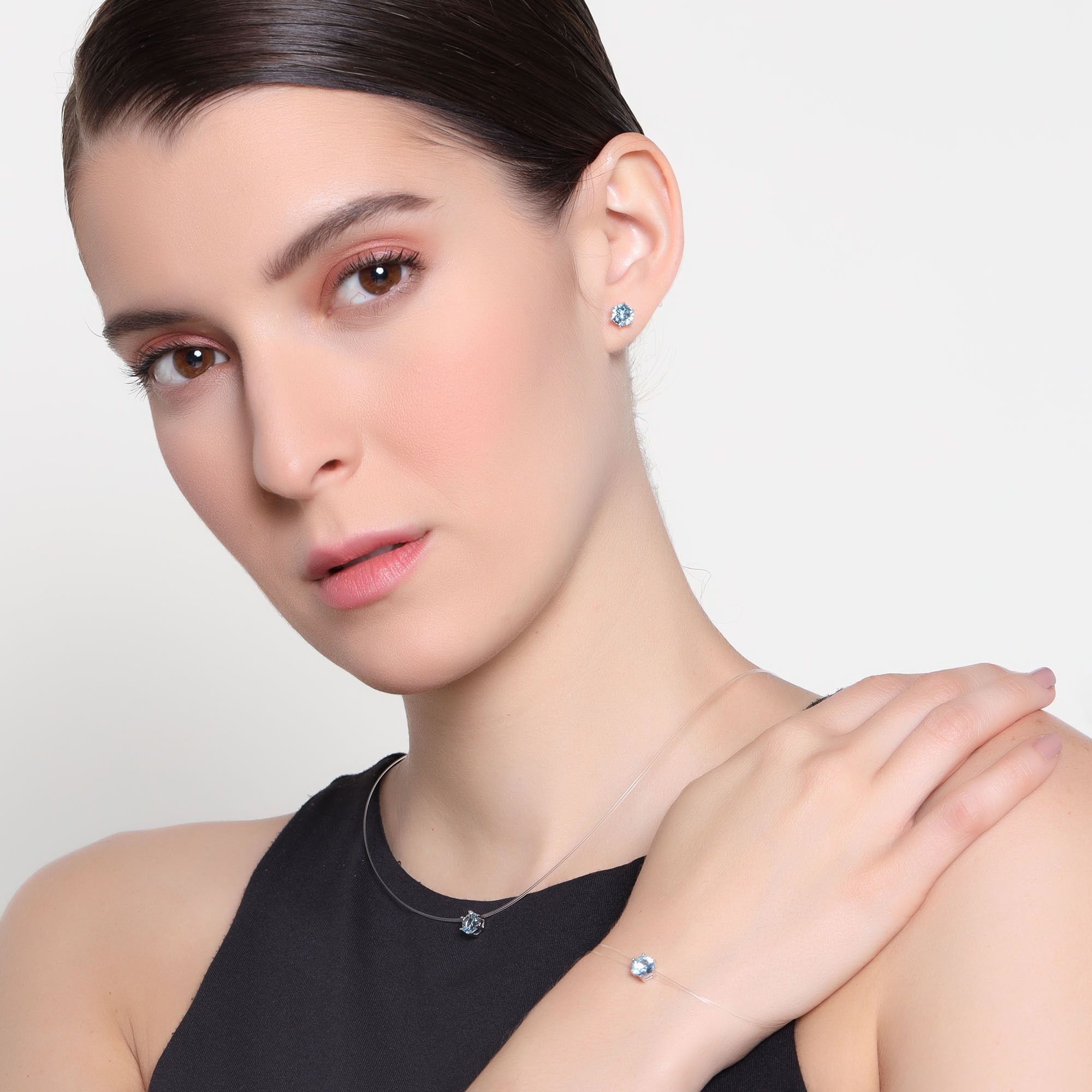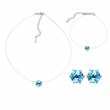 Juego de aretes, pulsera y dije en baño de oro blanco de 18 quilates, diseño de círculo con incrustación de cristales en color azul.