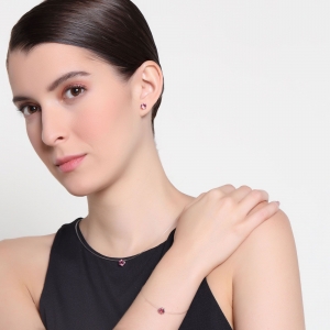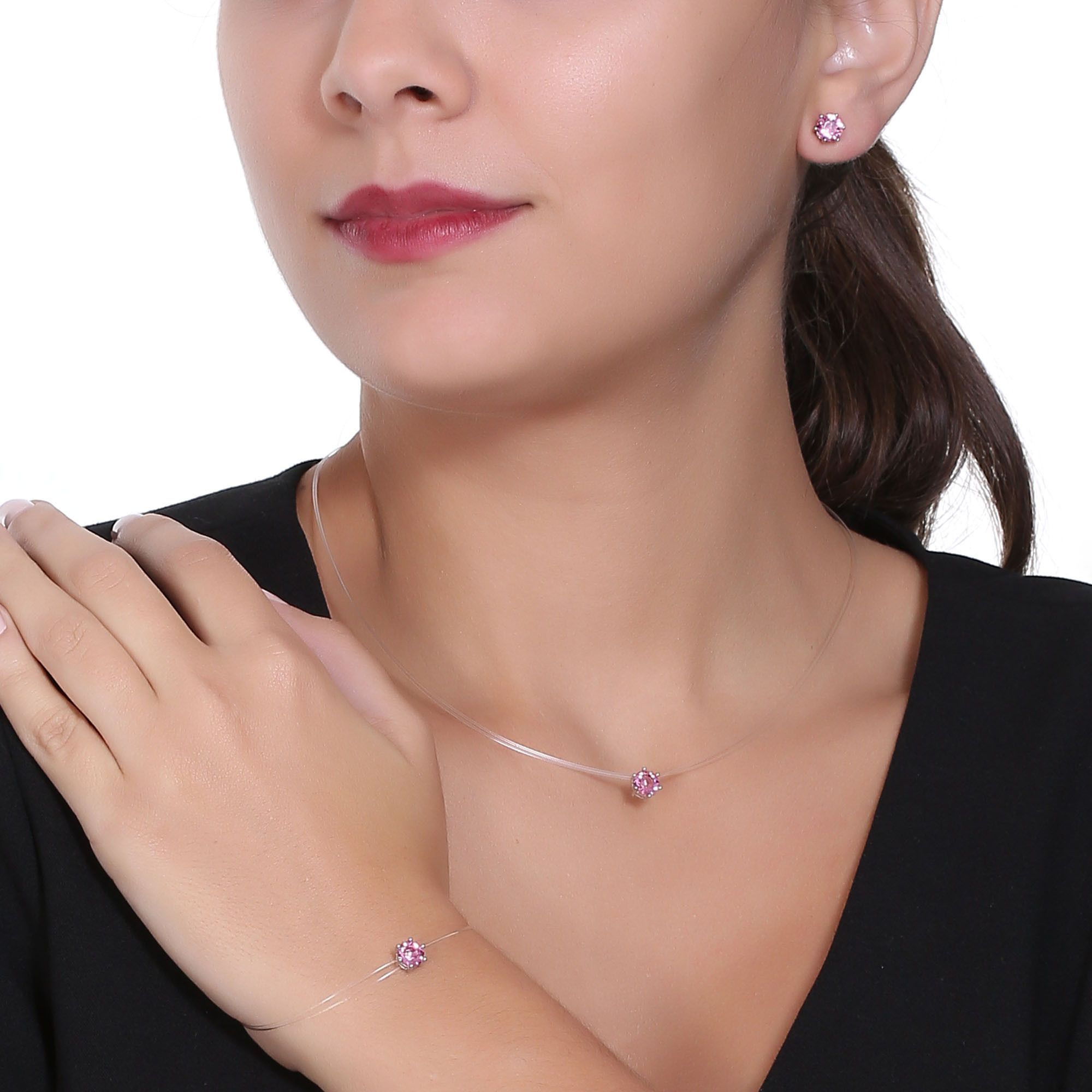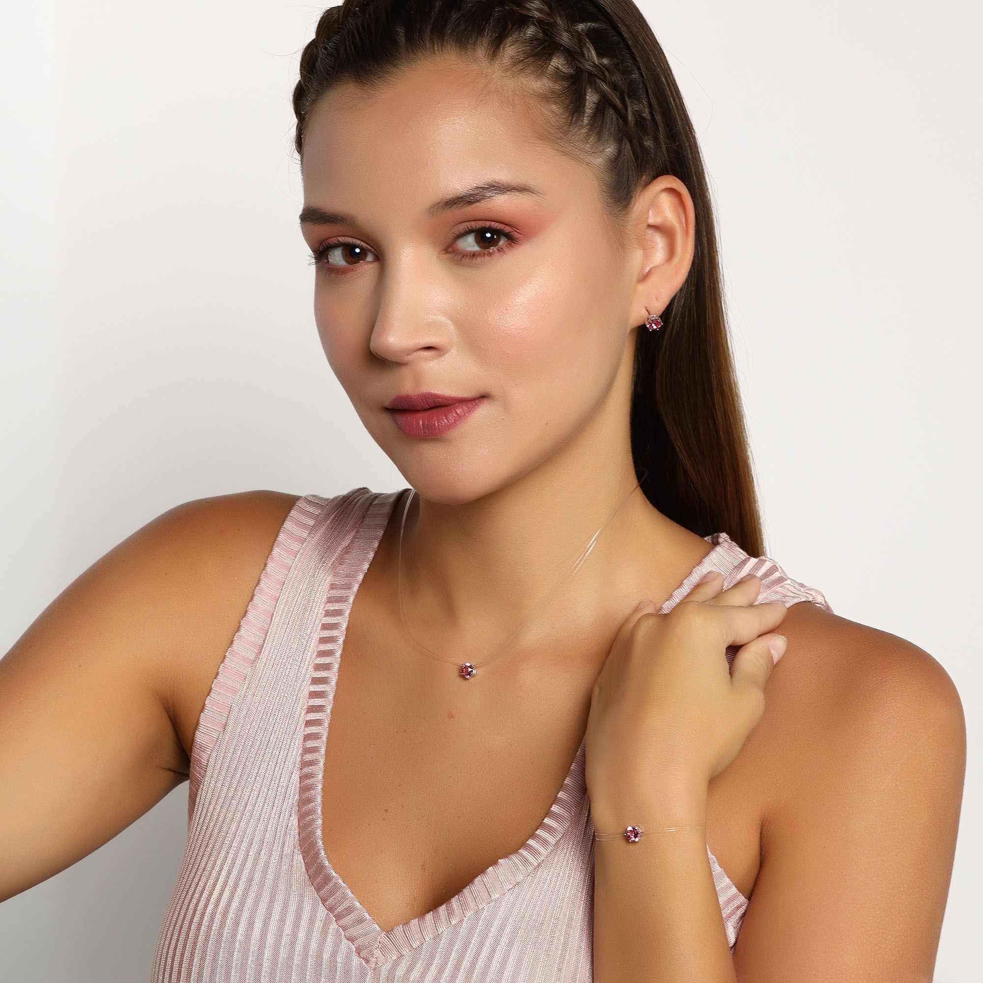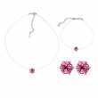 Juego de aretes, pulsera y dije en baño de oro blanco de 18 quilates, diseño de circulo con incrustación de cristales en color rosa.