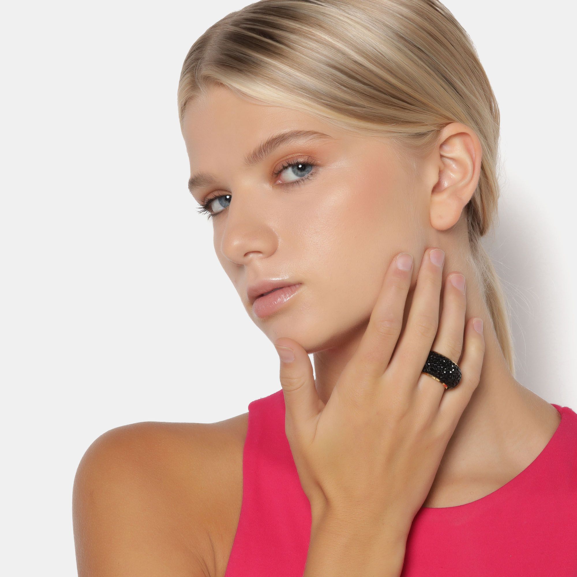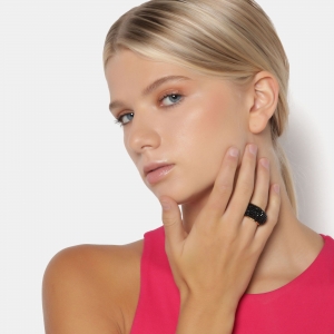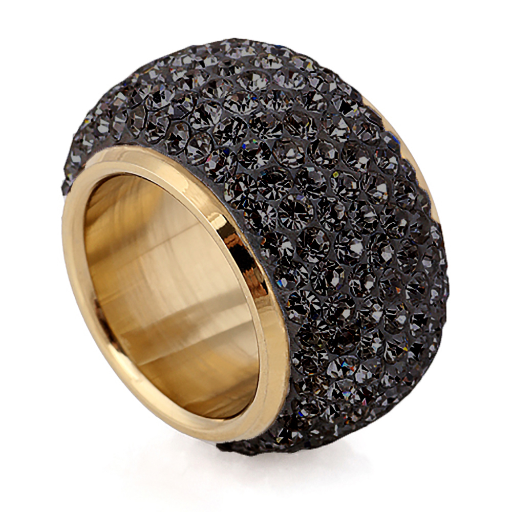 Anillo de acero inoxidable, hermoso diseño estilo convexo, con incrustación de cristales en color negro.