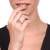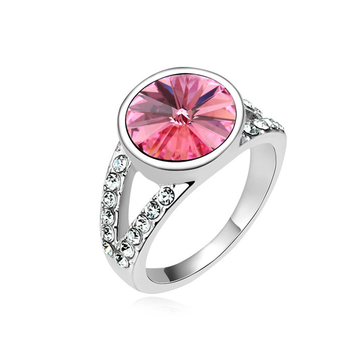 Lindo anillo en baño de oro blanco de 18 quilates, diseño estilo aro doble, con cristal rosa corte redondo e incrustaciones de cristales blancos.