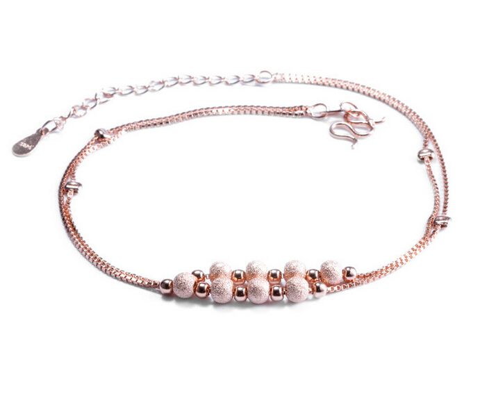 Hermosa pulsera, en baño de oro rosa de 18 quilates, exquisito diseño, con cuentas rosadas y chispas de cristales.