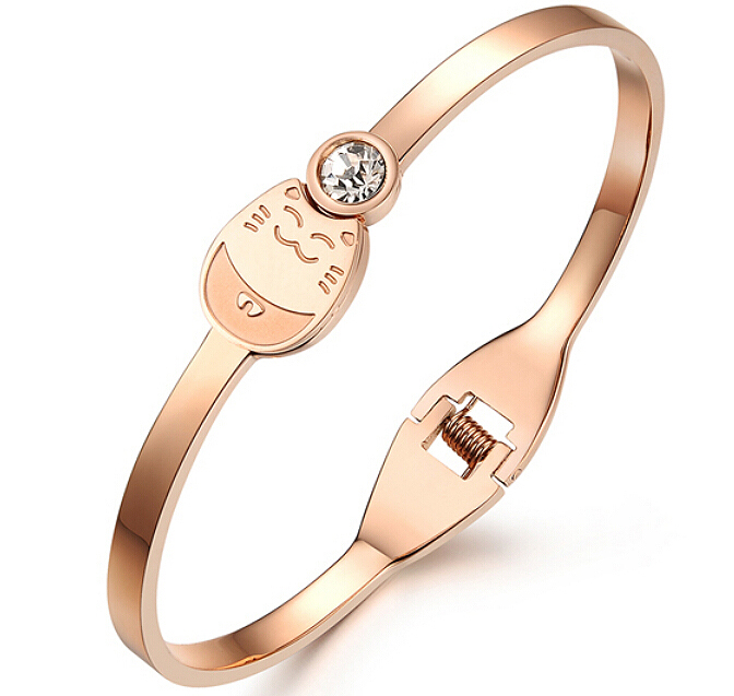 Hermoso brazalete, en baño de oro rosa de 18 quilates, tierno diseño de gato, con incrustación de cristal blanco.