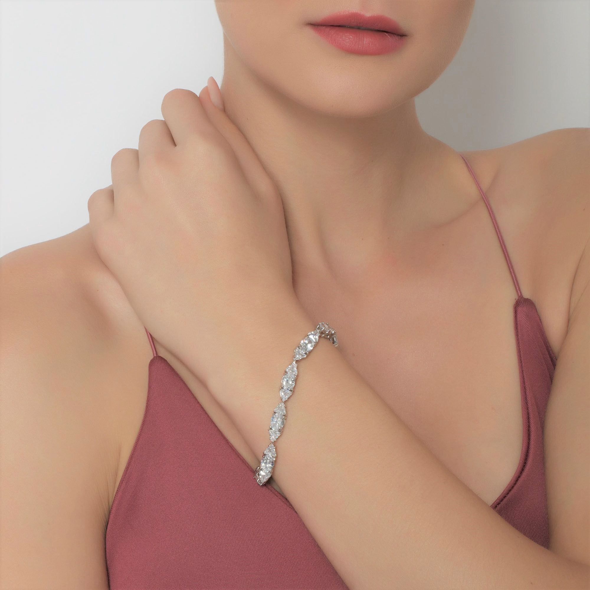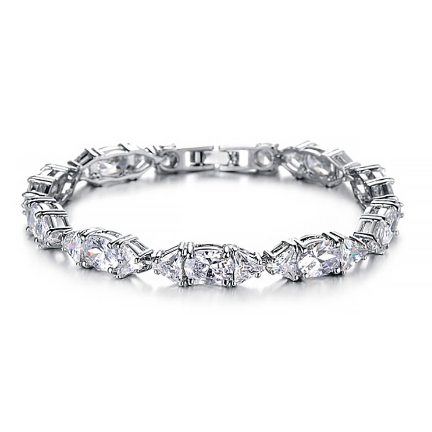 Hermoso brazalete, en baño de oro blanco de 18 quilates, fino diseño geométrico, con incrustación de cristales blancos en corte oval y corte trillion.