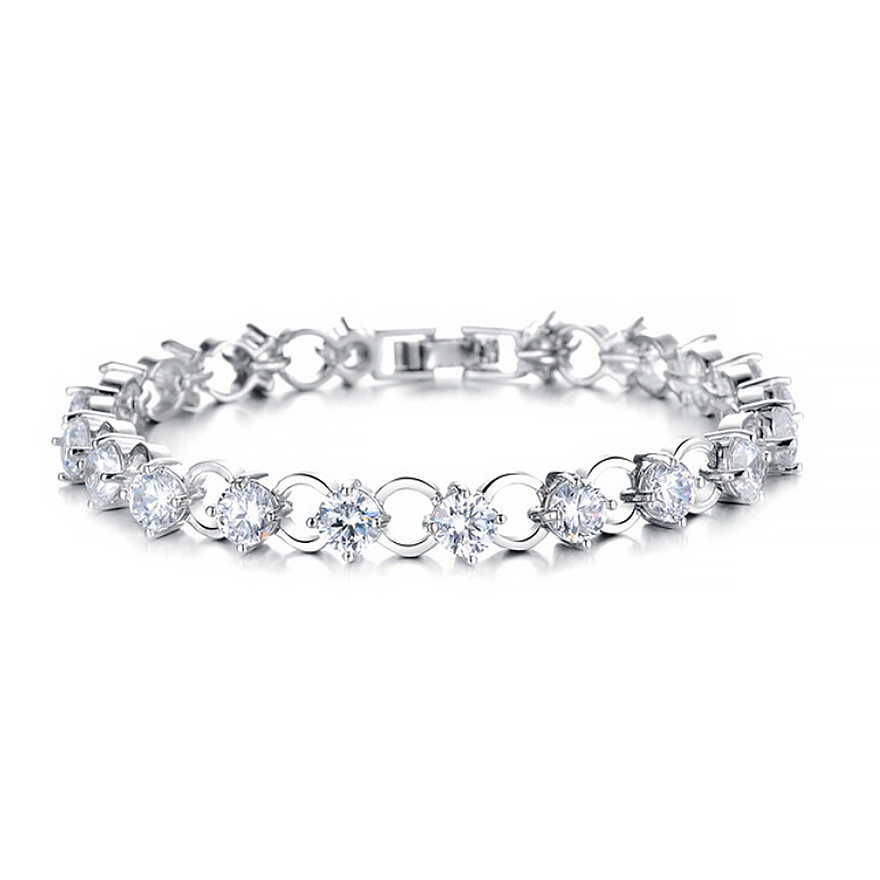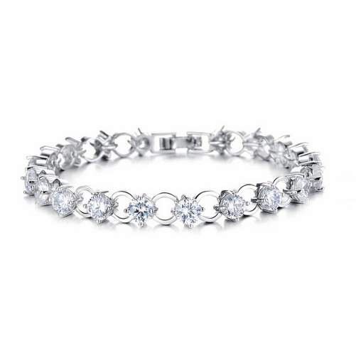 Hermoso brazalete, en baño de oro blanco de 18 quilates, diseño de aros engarzados, con incrustaciones de cristales en color blanco.