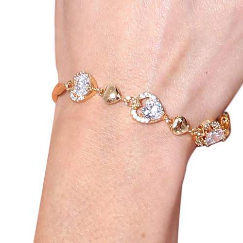Hermoso brazalete, en baño de oro amarillo de 18 quilates, diseño de corazones, con incrustaciones de cristales en color blanco.