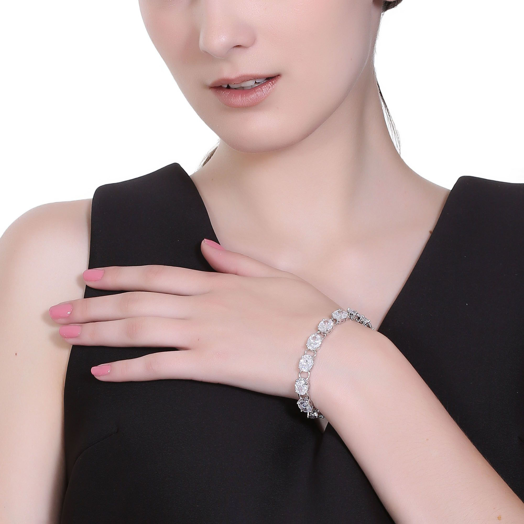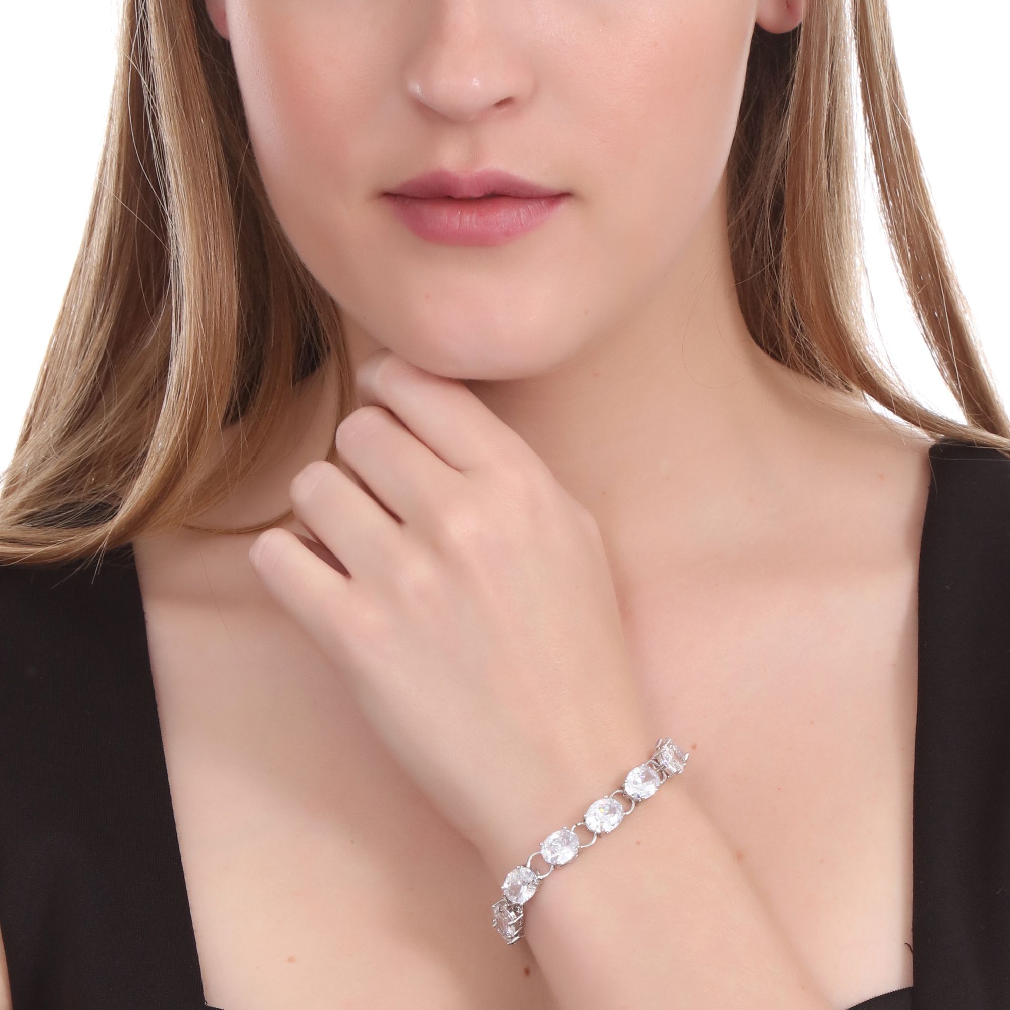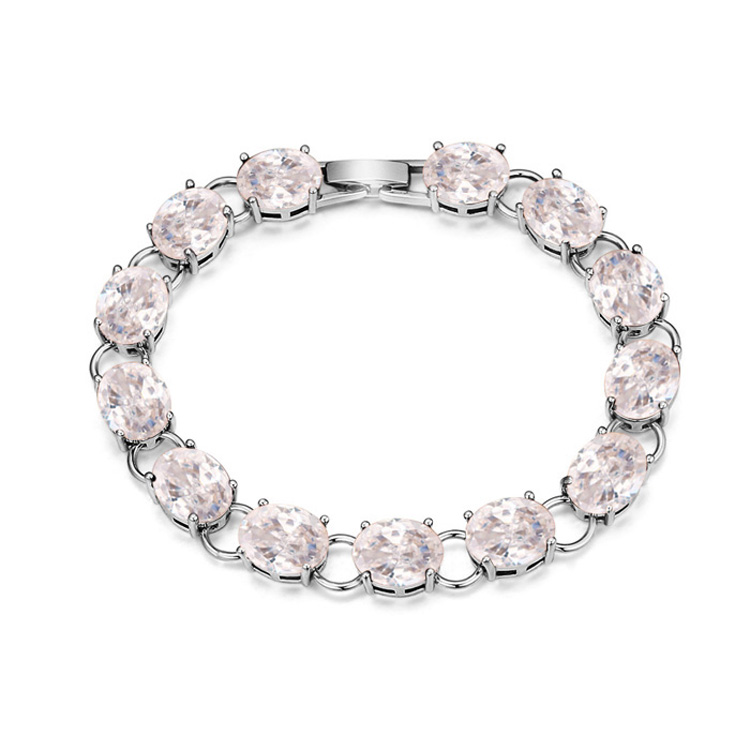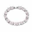 Precioso brazalete, en baño de oro blanco de 18 quilates, elegante diseño de eslabones con incrustación de cristales en color blanco. Fabricado en una estructura de aleación de platino con rodio sin níquel.