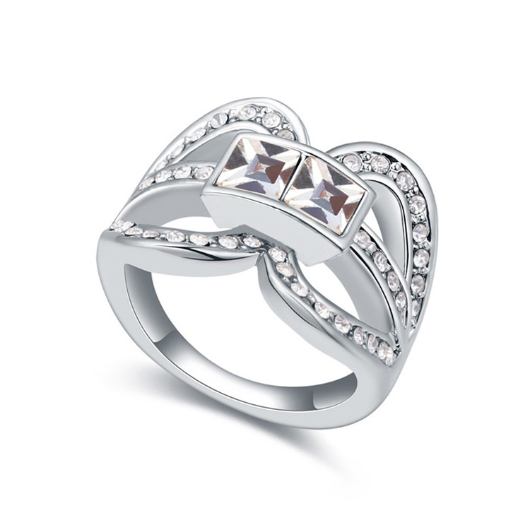 Lindo anillo en baño de oro blanco de 18 quilates, diseño de curvas, con cristales blancos corte princesa e incrustaciones de cristales en color blanco.