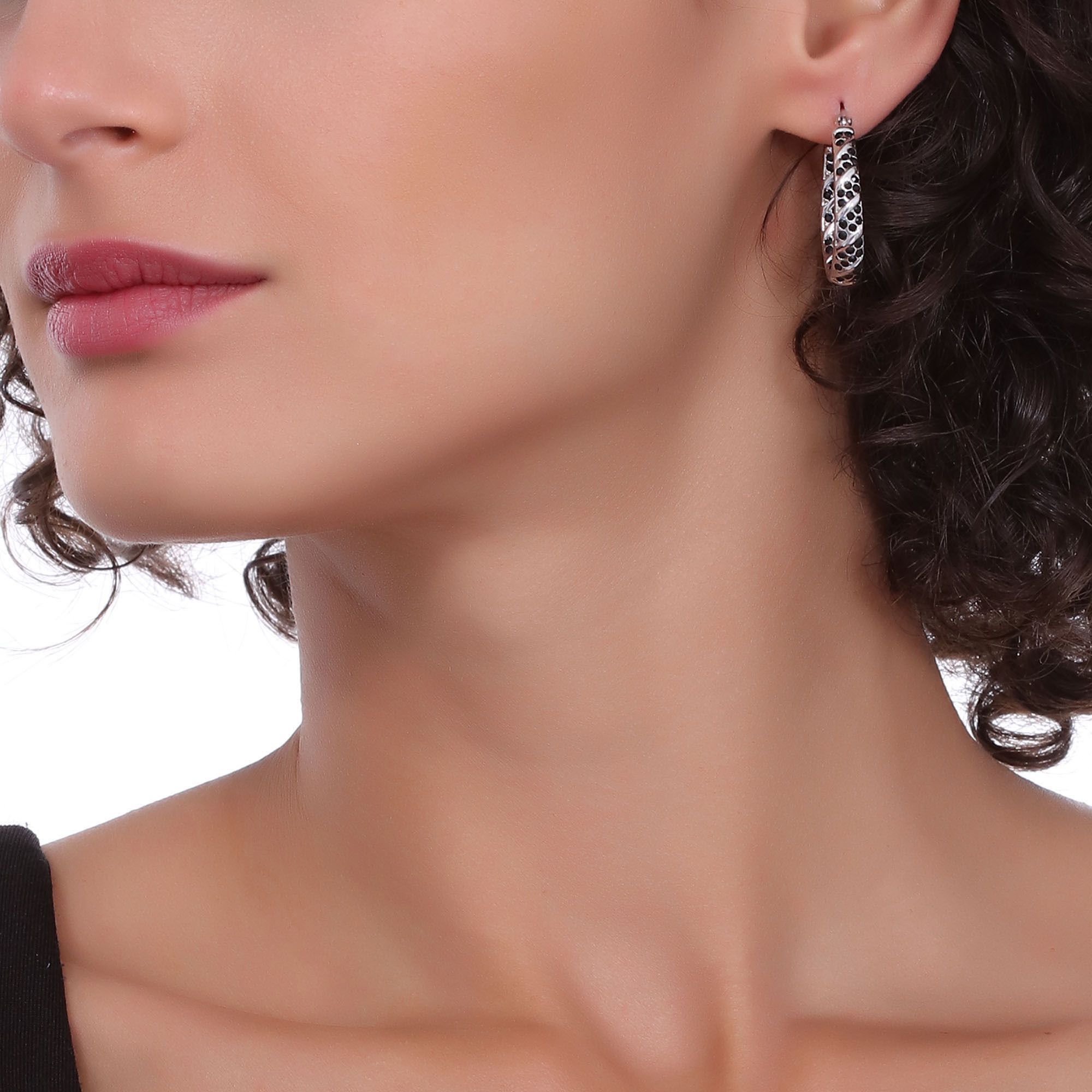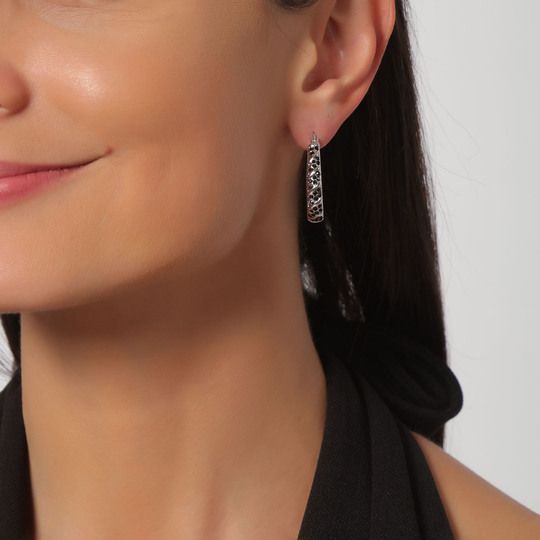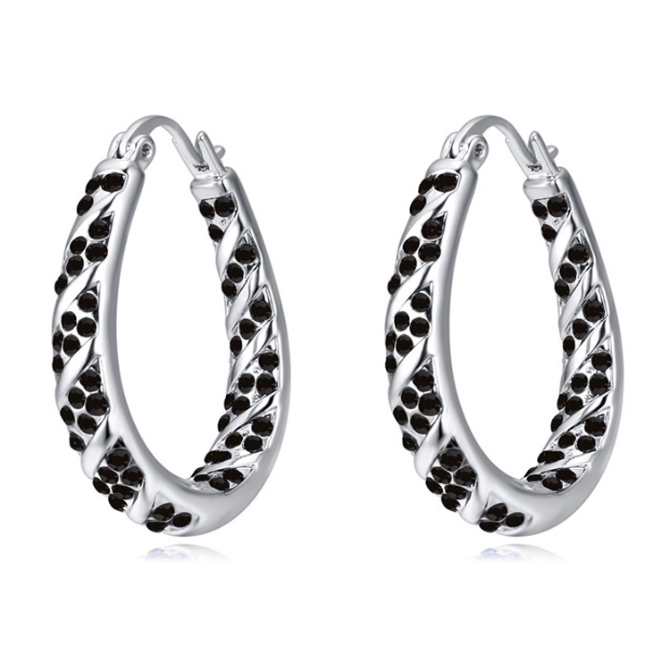 Hermosas arracadas en baño de oro blanco de 18 quilates, diseño de gota, estilo trenzado, con incrustación de cristales en color negro.