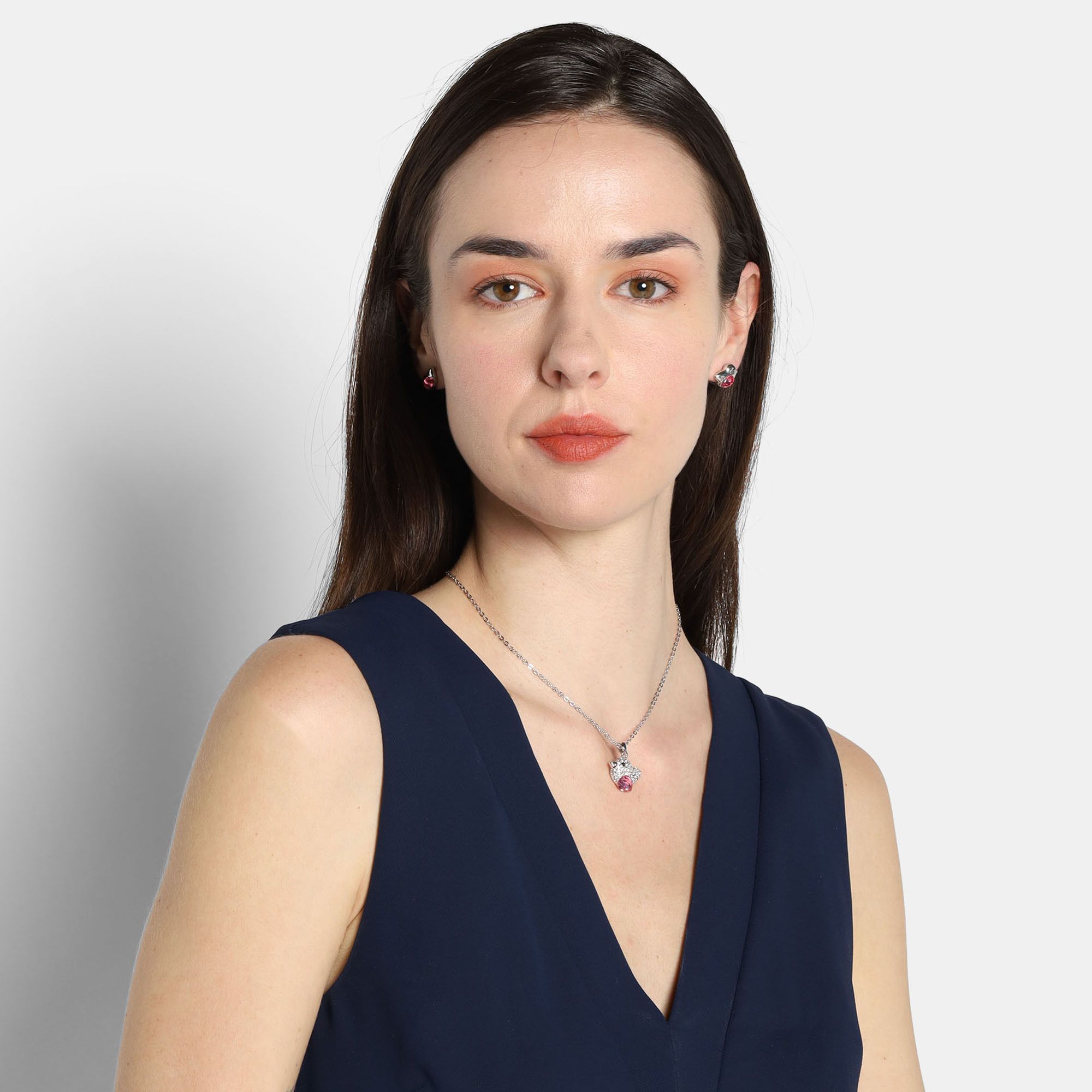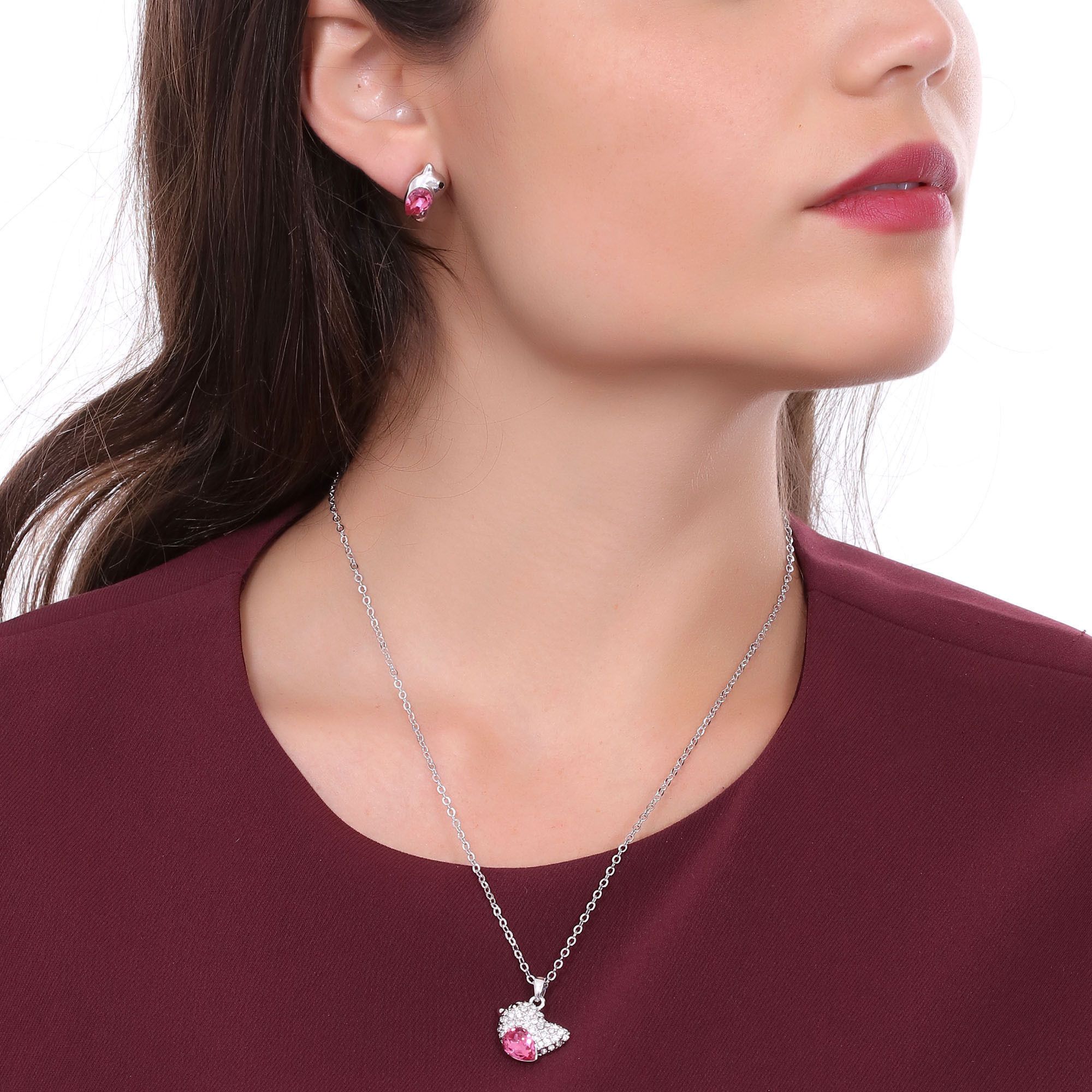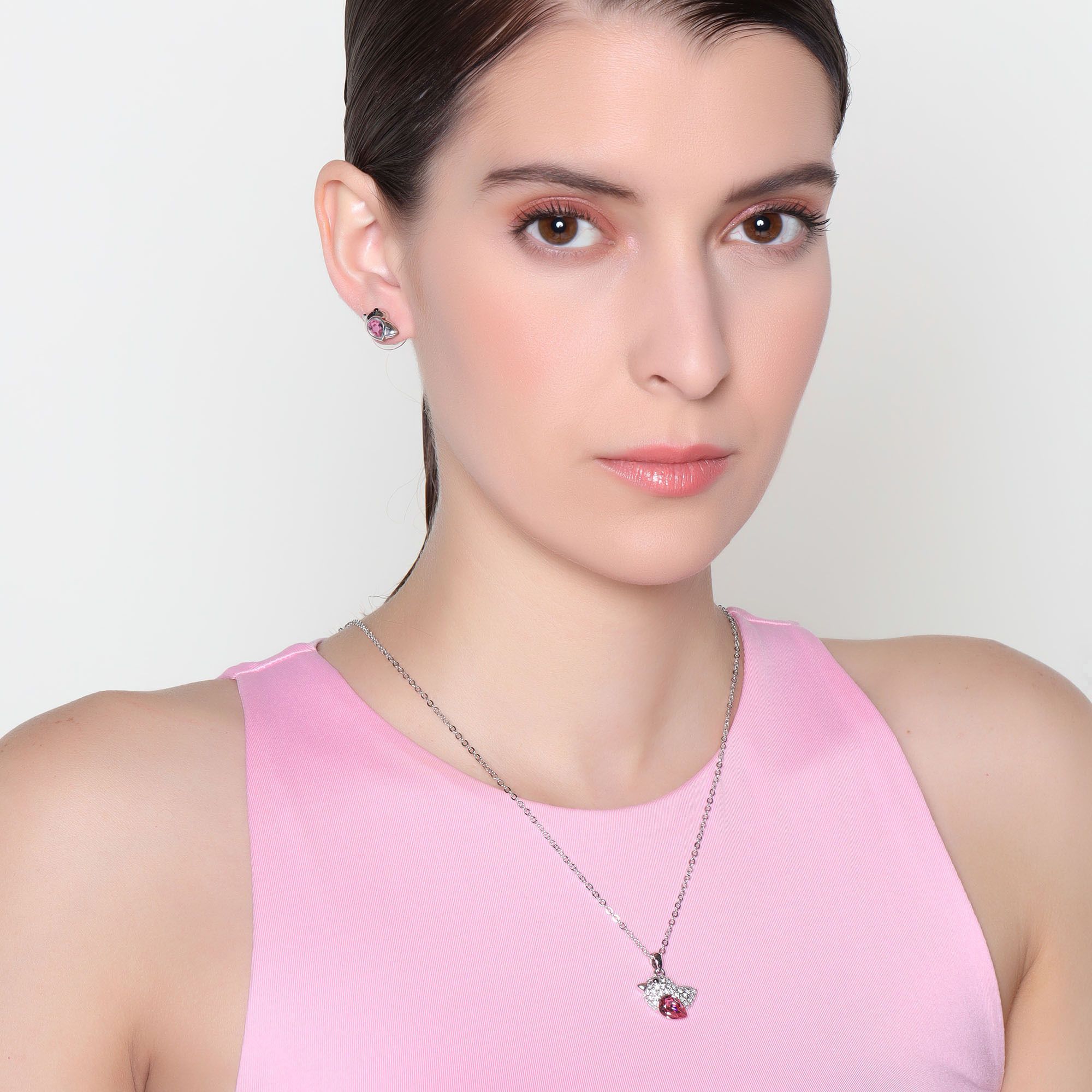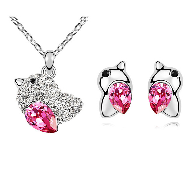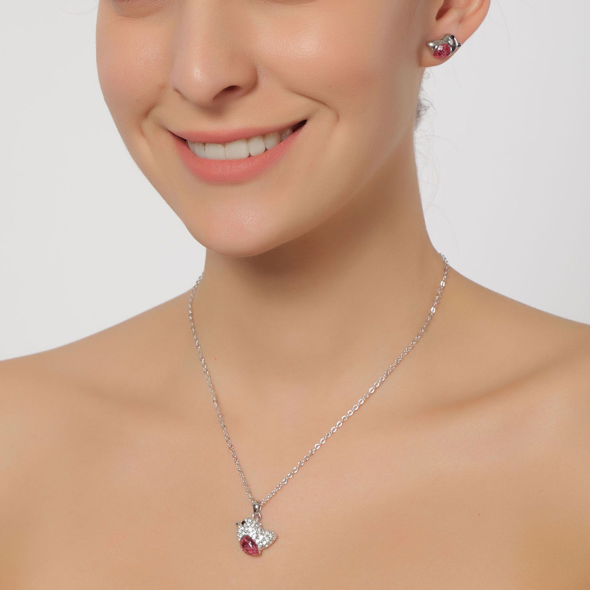 Juego de aretes y dije en ba�o de oro blanco de 18 quilates, dise�o de ave con incrustaci�n de cristales en color rosa y blanco.