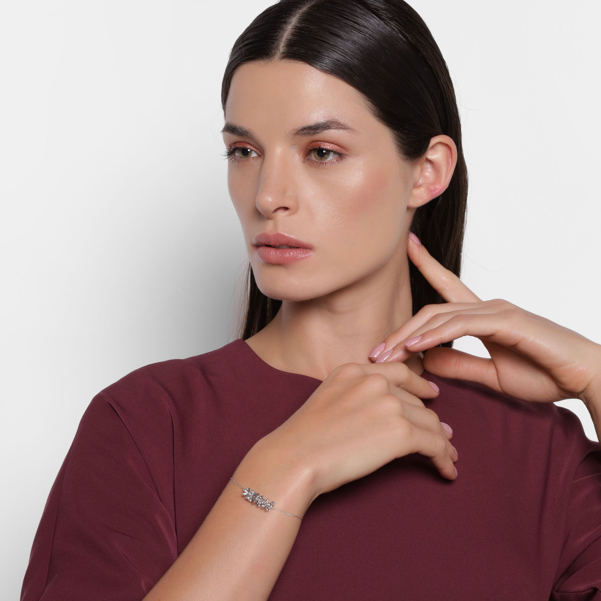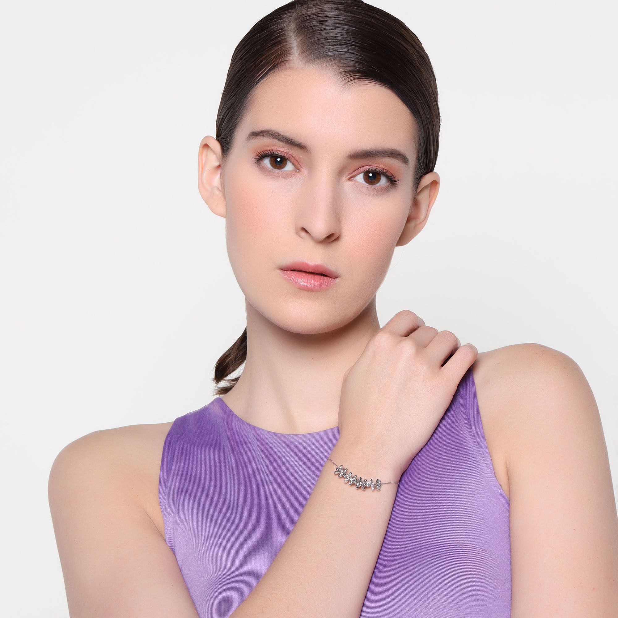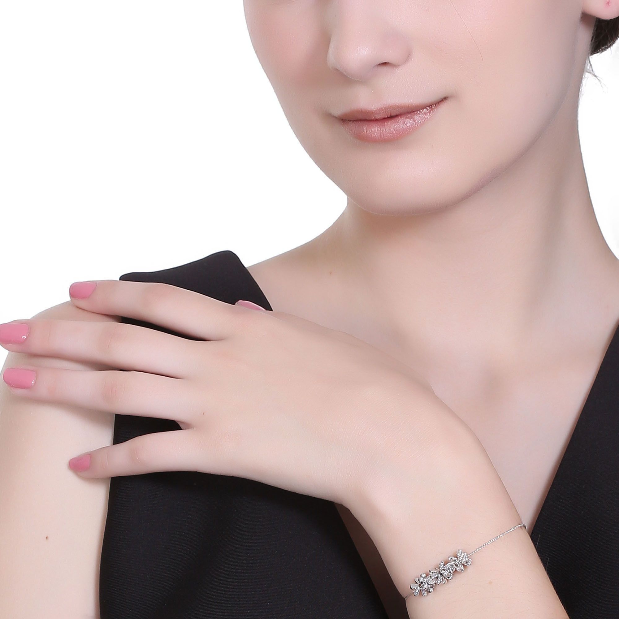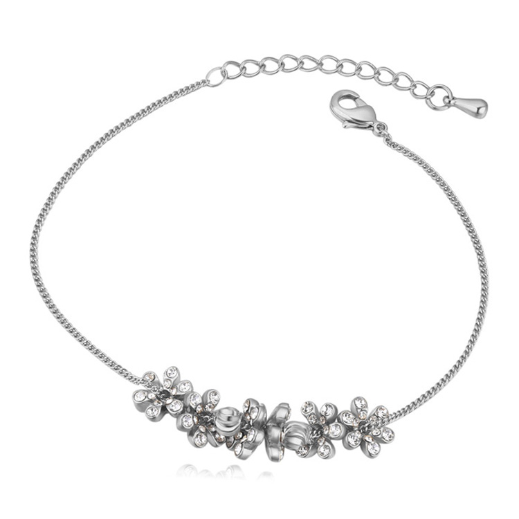 Linda pulsera, en baño de oro blanco de 18 quilates, diseño de flores, con cuentas plateadas e incrustación de cristales color blanco.